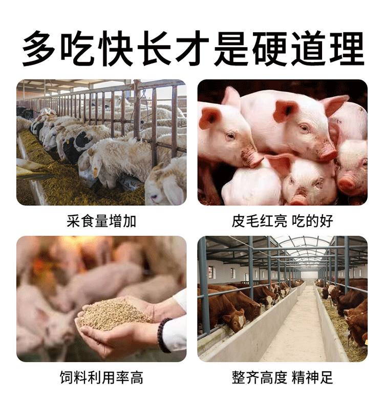产品简介:3天看采食,7天看粪便,15天皮红毛亮,吃完就睡!长期添加提前20-30天出栏,每头猪多赚500元;