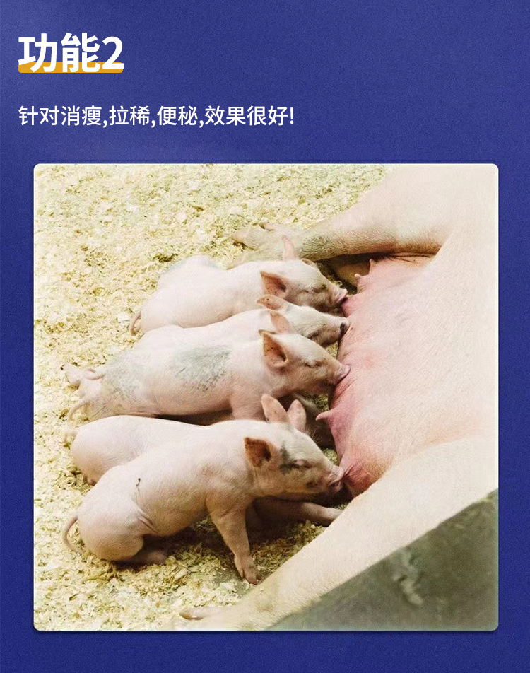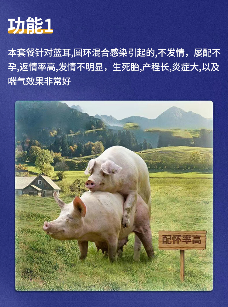 产品简介:针对蓝耳、圆环混合感染引起的不发情、屡配不孕、返情率高、发情不明显、生死胎、产程长、炎症大以及喘气、消瘦、拉稀、便秘、效果好!