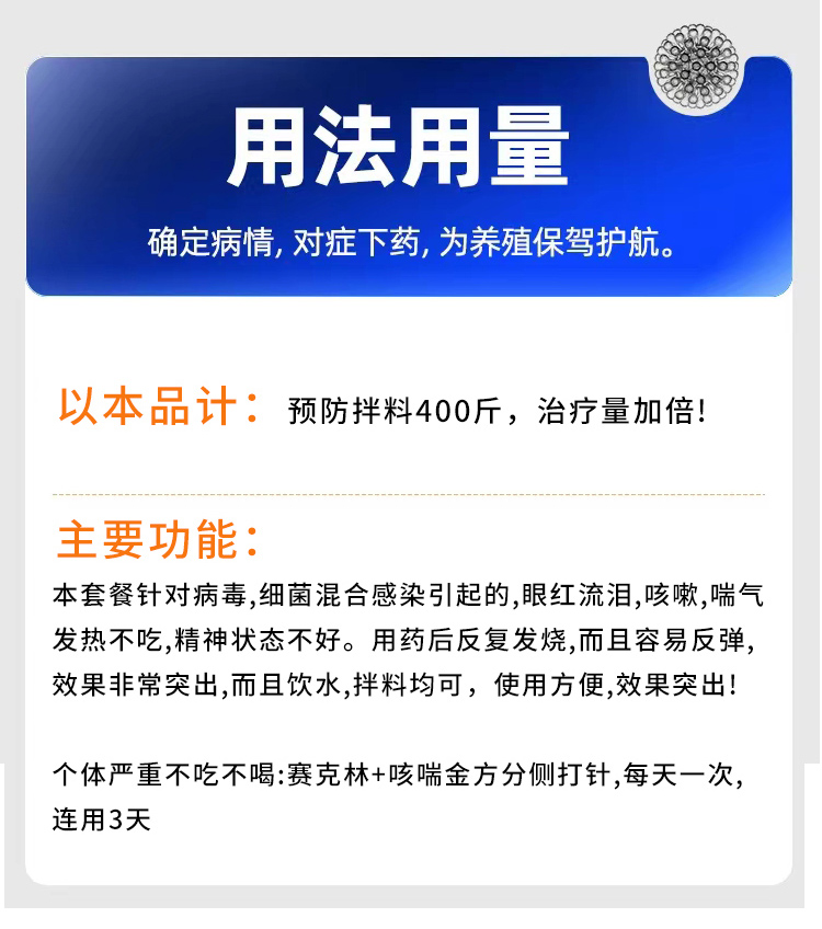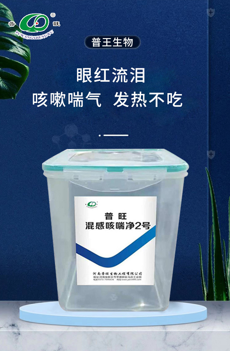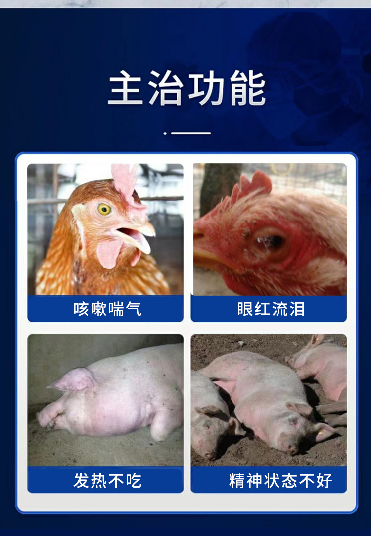 产品简介:针对病毒,细菌混合感染引起的,眼红流泪,咳嗽,喘气,发热不吃,精神不好,用药后反复发烧,而且容易反弹,效果非常突出,饮水或拌料均可,使用方便,效果突出!