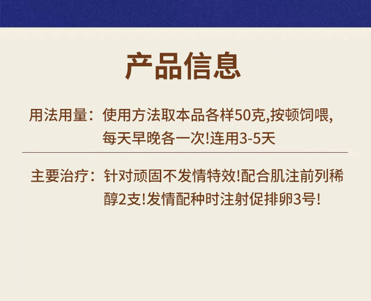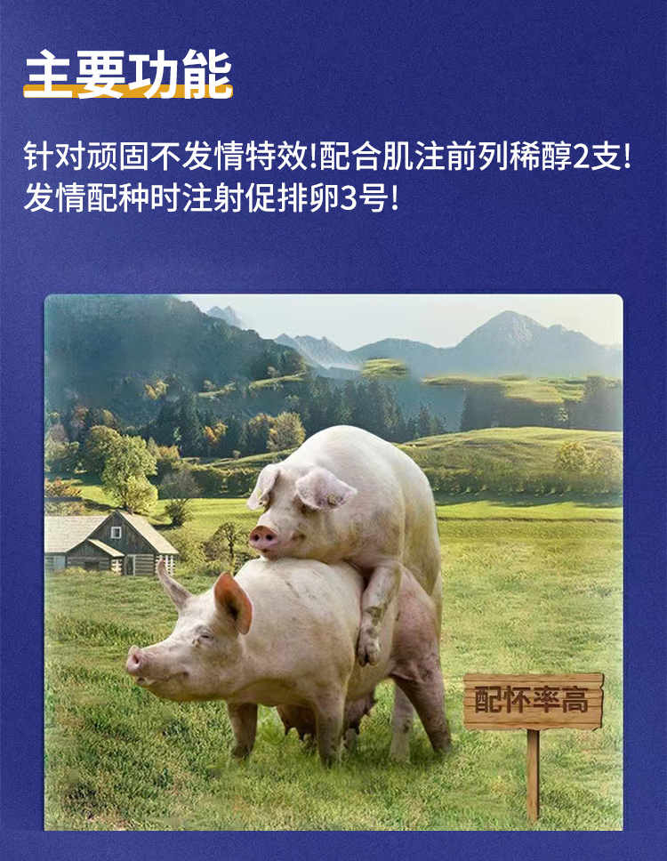 产品简介:针对顽固不发情有特效,配合肌肉注射前列稀醇2支,发情后配种前注射促排卵素2支即可;