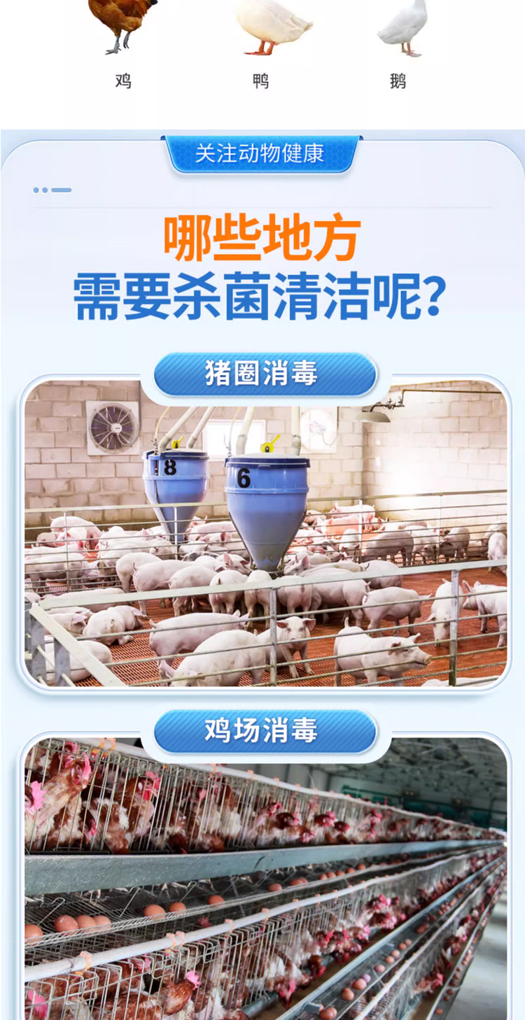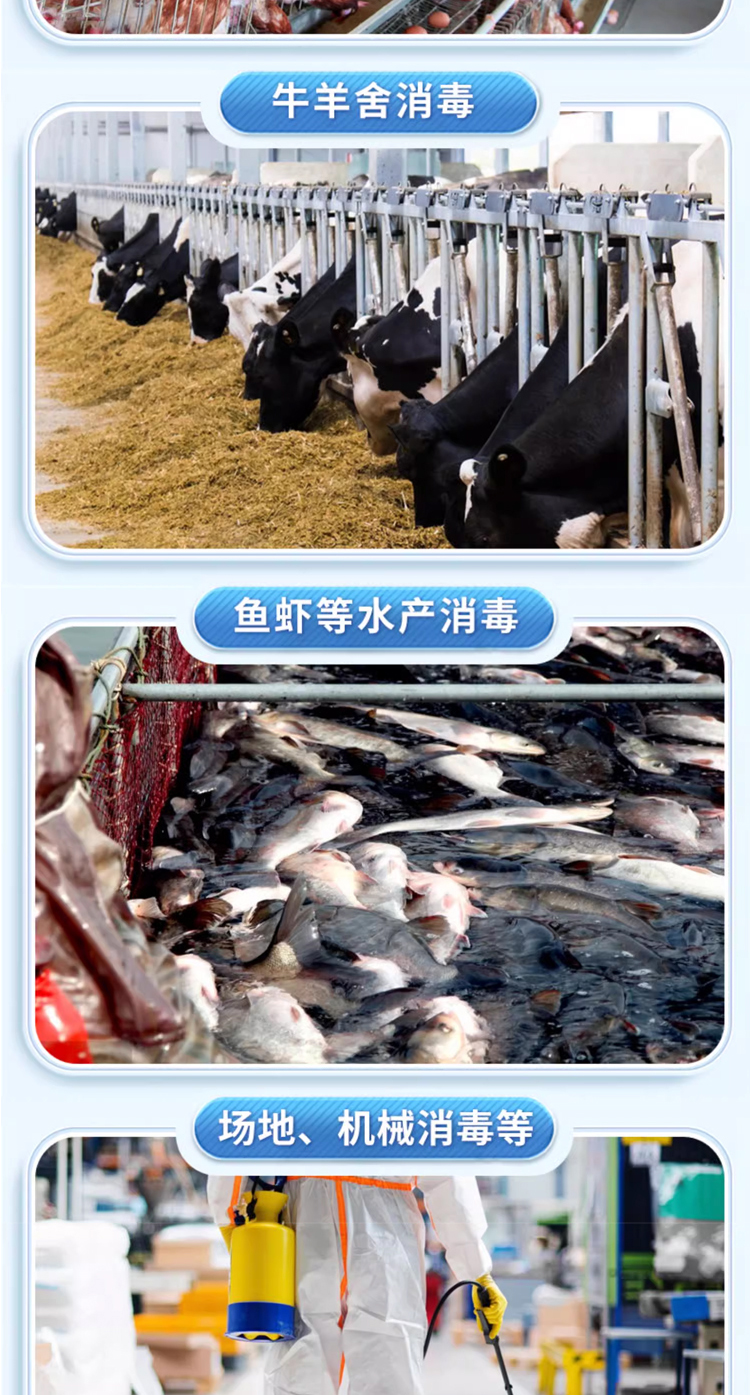 4、使用方便,可喷雾、熏蒸、干撒、浸泡、器械、饮水消毒都无需考虑不良反应;