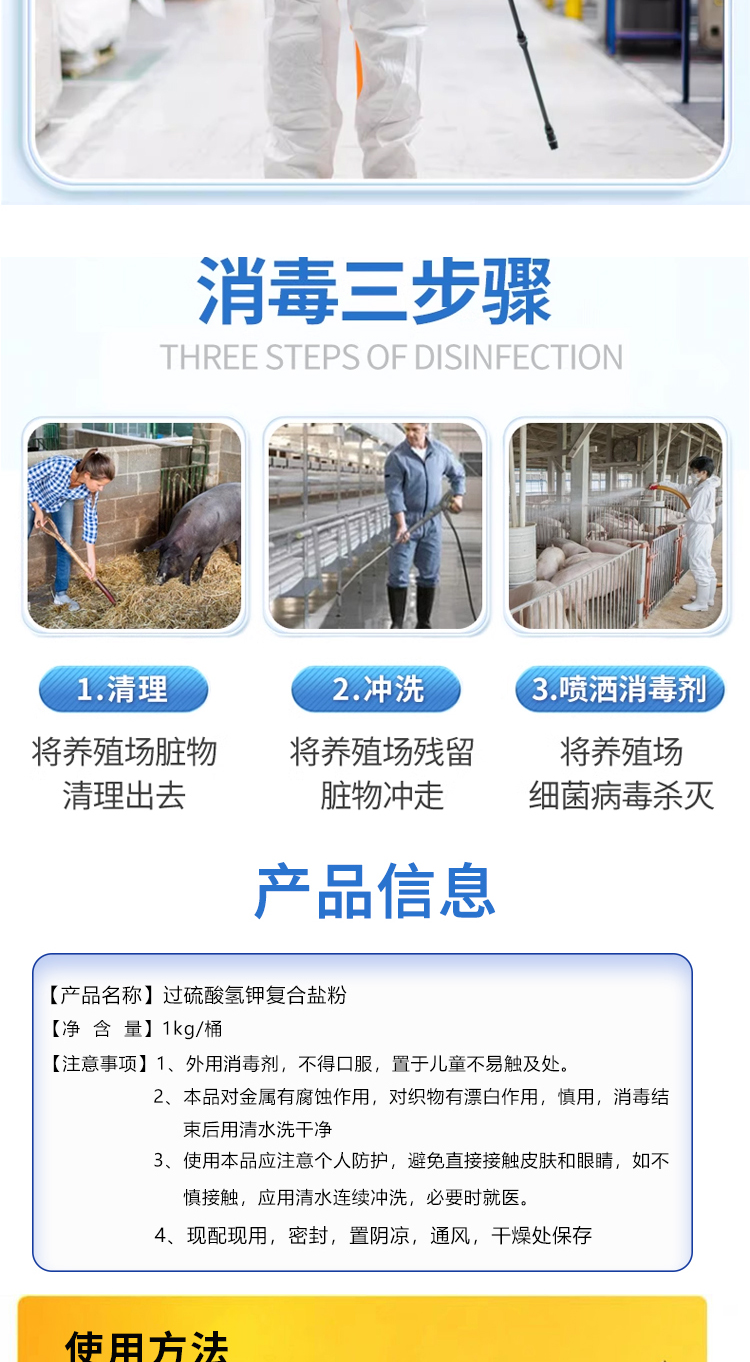 兑水喷洒:1::200的比例兑水喷洒(带猪消毒);