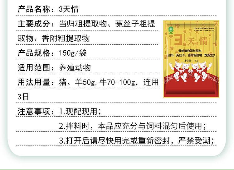 特效催情,促排卵,减少空怀,增加产子数,修复母猪生殖系统,3天发情,5天配种。