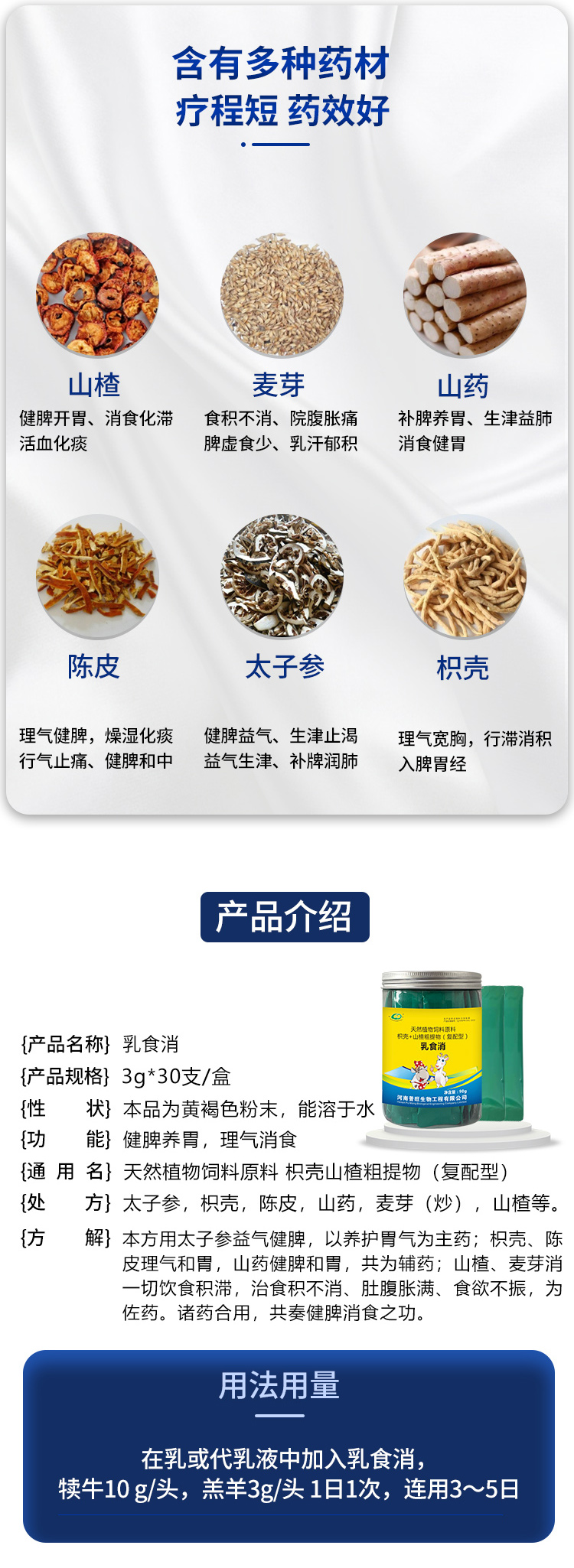 健脾健胃益气消食 解决牛犊羊羔消化不良 在乳或代乳液中加入乳食消 犊牛10g/头 羔羊3g/头 连用3-5日 " />