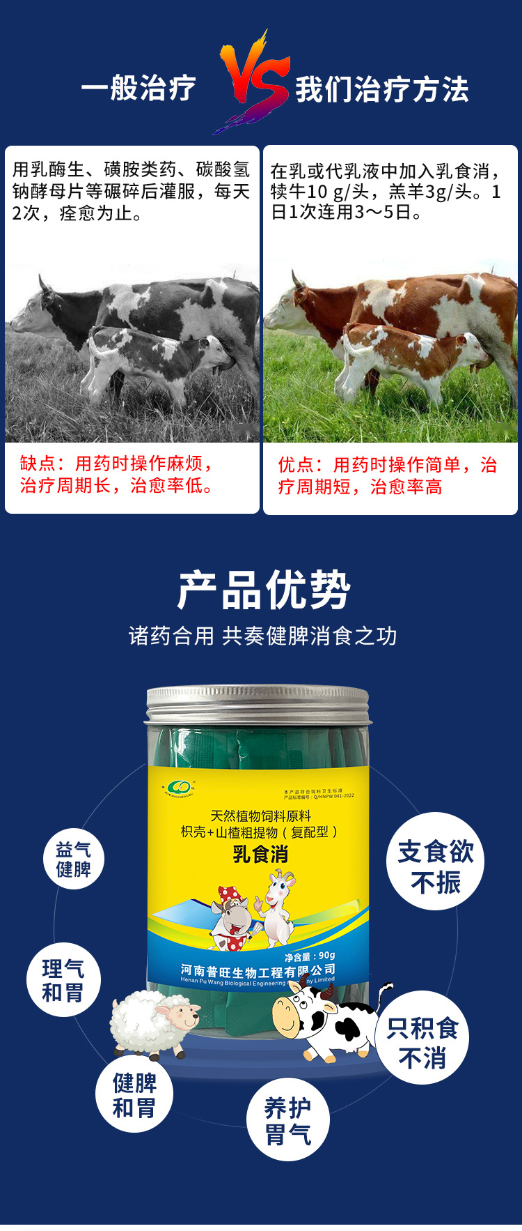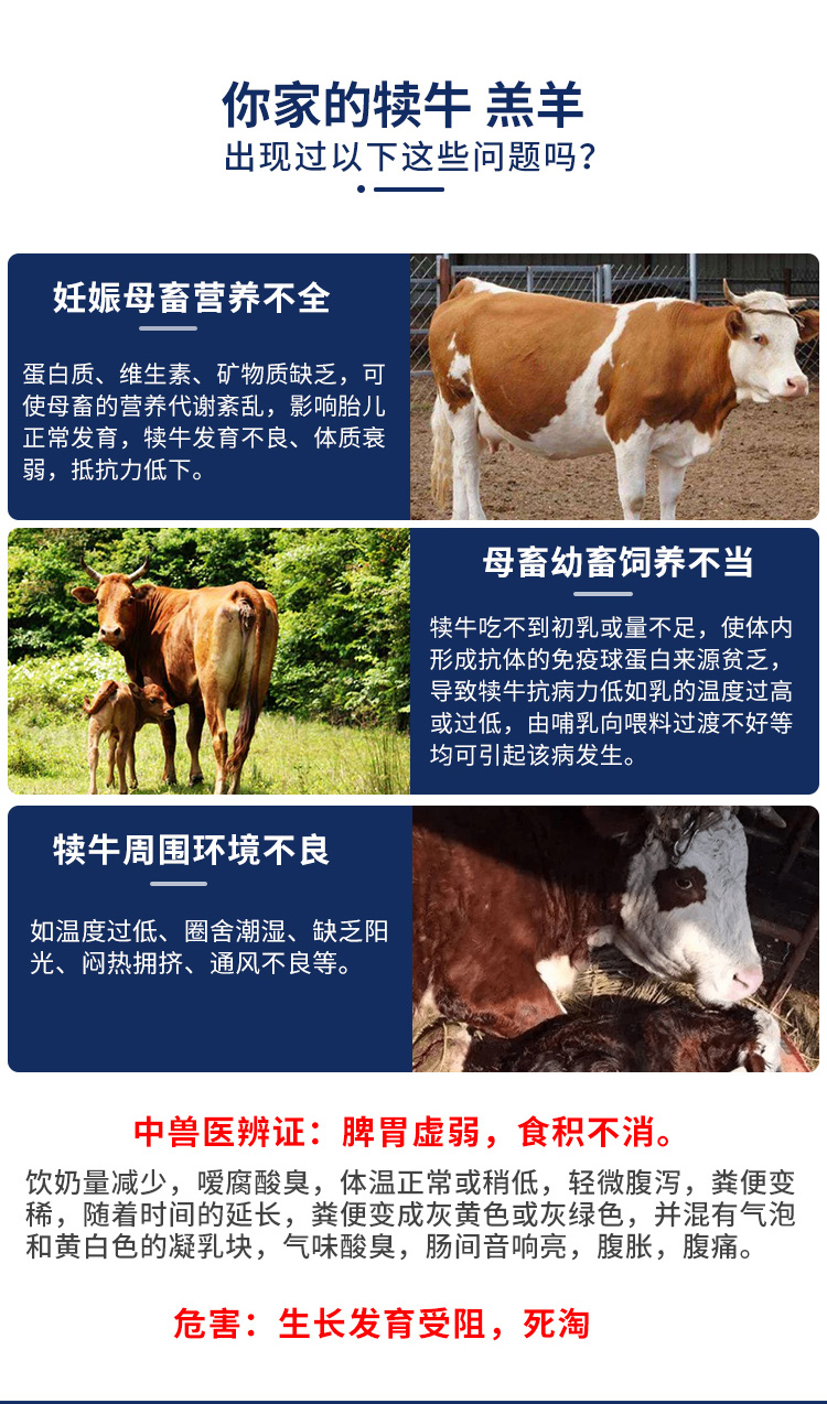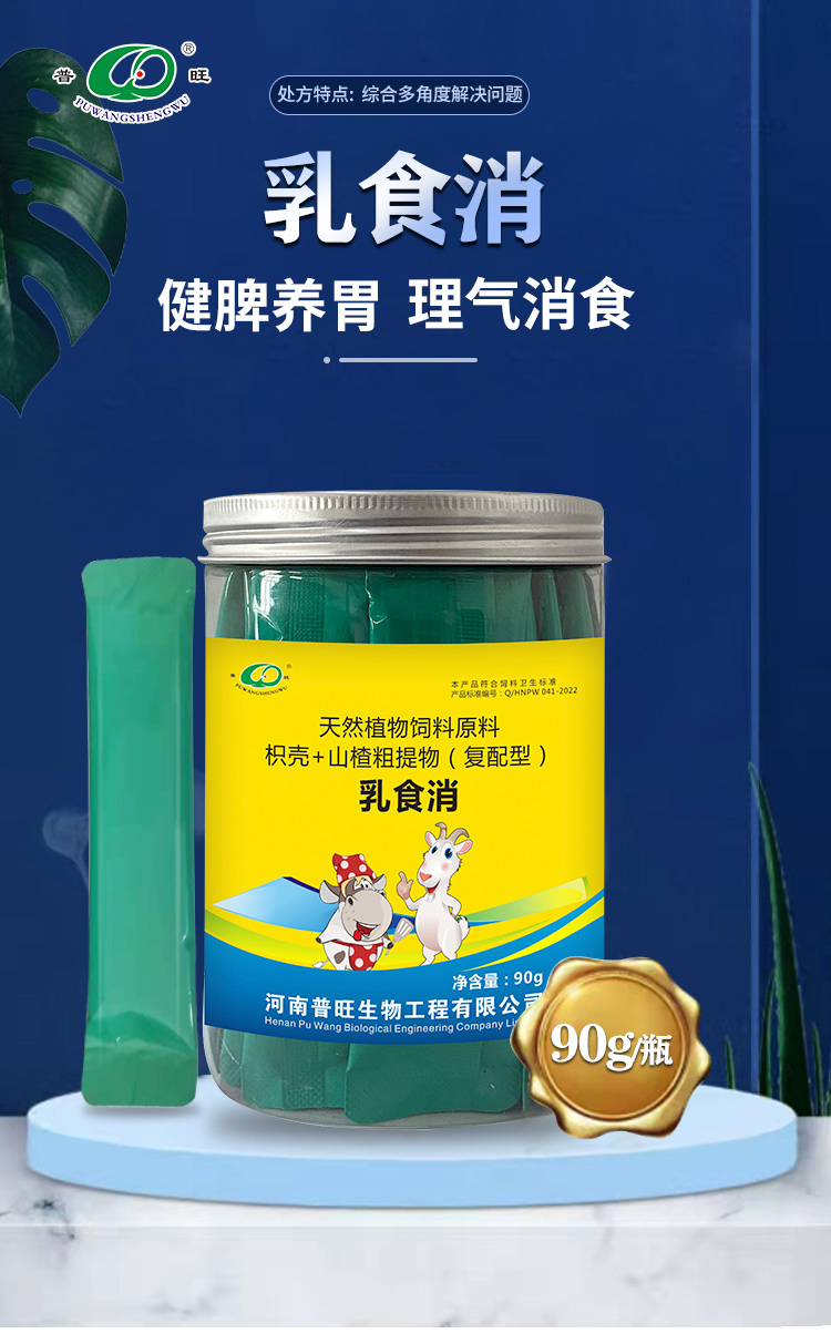 产品简介:普旺生物乳食消 健脾健胃益气消食 解决牛犊羊羔消化不良 在乳或代乳液中加入乳食消 犊牛10g/头 羔羊3g/头 连用3-5日
