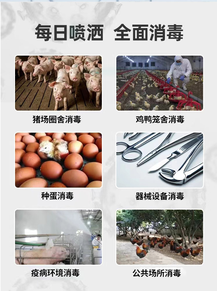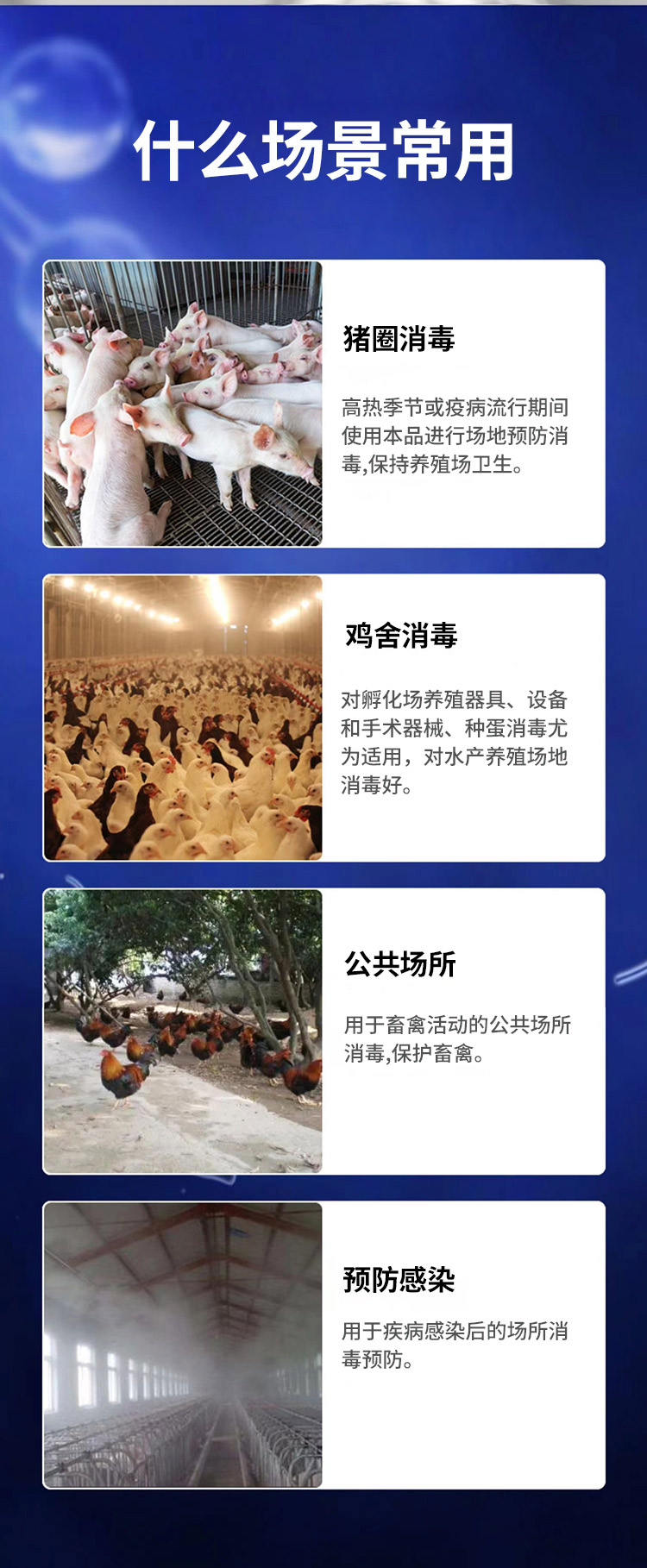 2适用于家畜口蹄疫、蓝耳病、烈性、温和性猪瘟、圆环病毒、蓝耳病、弓形体、附红细胞体、链球菌、传染性胃肠炎、流行性泻痢及无名症的传染性高热病等病毒性、细菌性疾病的消毒预防。