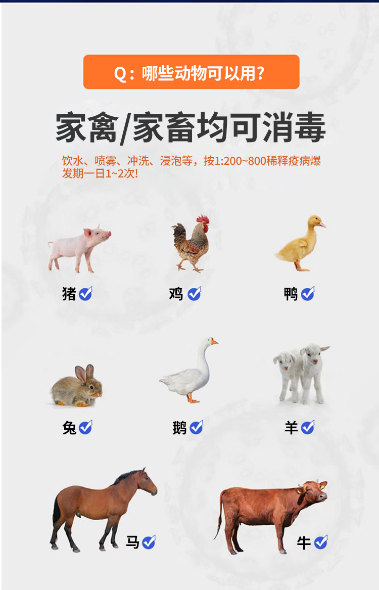 【用法用量】饮水、喷雾、冲洗、浸泡等,按1:200-800稀释详见标签说明书,疫病暴发期一日1-2次