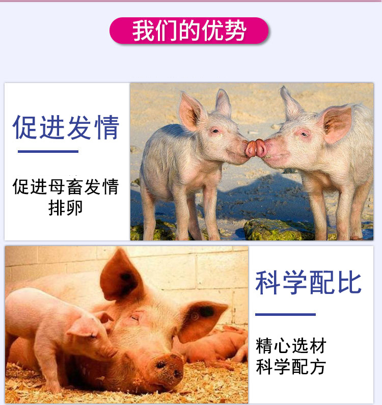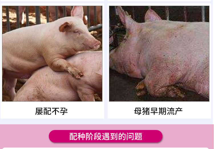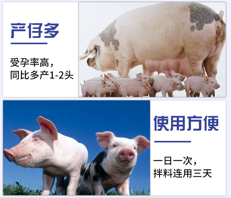预防和治疗各种原因引起的后备母猪和经产母猪发情推迟、不发情、乏情、反复发情、屡配不孕、母猪早期流产等,提高受胎率、增加产仔数;公猪使用可有效改善精子质量,提高精子活力。