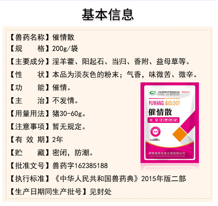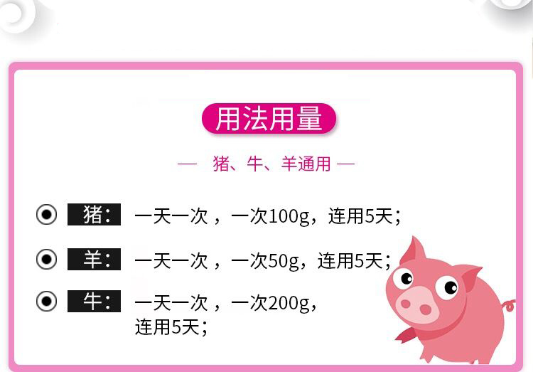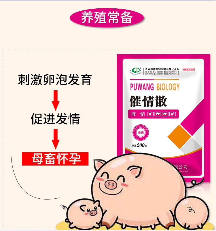 【用法用量】灌服或混饲:一次量,猪30-60g,一日1次,连用3日,一般饲喂2天后发情,发情后即可配种。