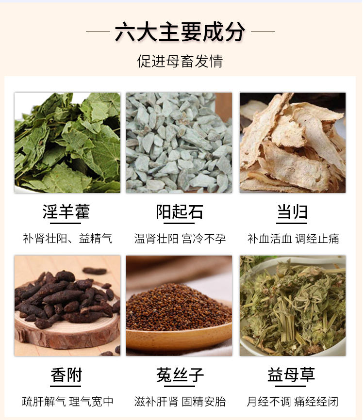 【主要成分】淫羊藿、阳起石、当归、香附、益母草、菟丝子、生育素、激卵素。