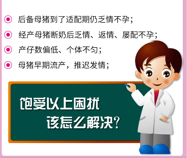 【适应症】预防和治疗各种原因引起的后备母猪和经产母猪发情推迟、不发情、乏情、反复发情、屡配不孕、母猪早期流产等,提高受胎率、增加产仔数;公猪使用可有效改善精子质量,提高精子活力。