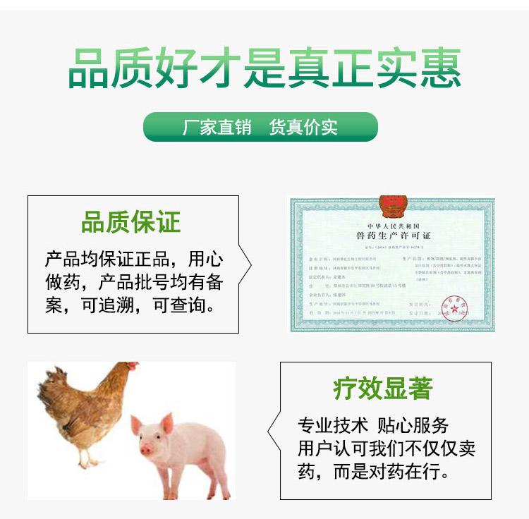 4、辅助药物使用时本品500g溶解于500kg饮水中,或拌料250kg,连用5-7天。