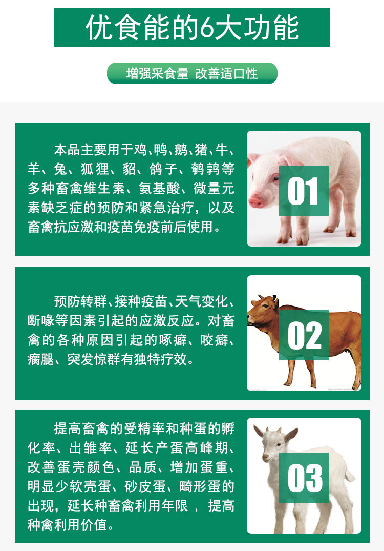 1、明显提高畜禽采食量,补充畜禽所需的各种营养。调节机体各器官功能,维持代谢平衡