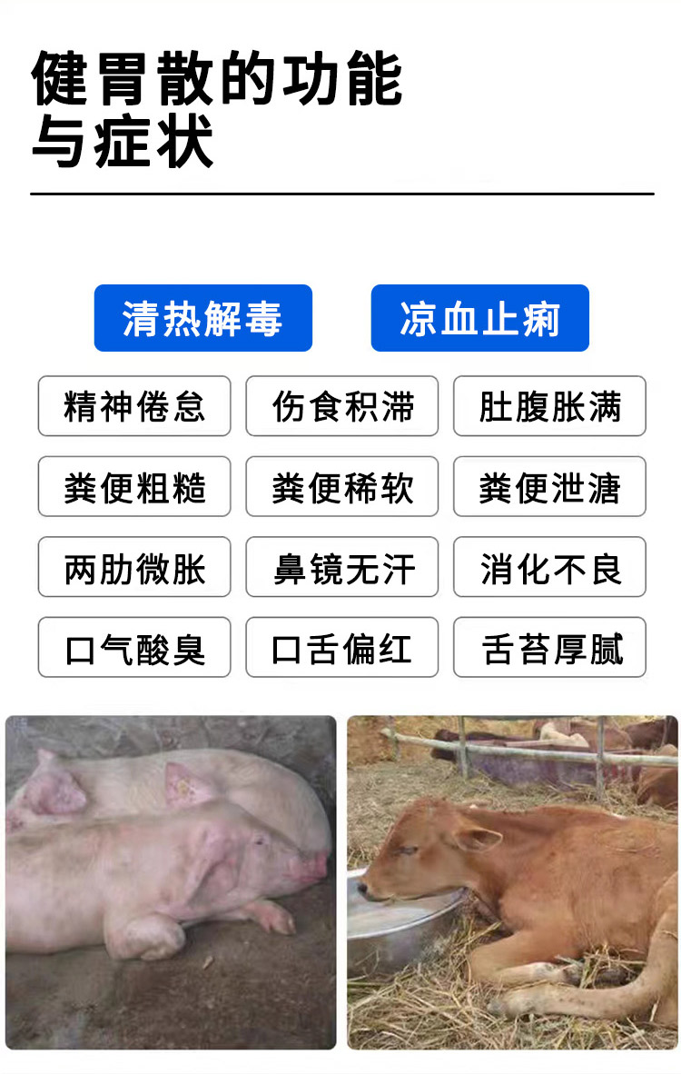 【主治】伤食积滞,消化不良。症见精神倦怠,水草减少或废绝,肚腹胀满,粪便粗糙或稀软,完谷不化,口气酸臭,口色偏红,舌苔厚腻,脉象洪大有力。牛反刍停止,两肋微胀,严重时鼻镜无汗,大便泻溏、恶臭。