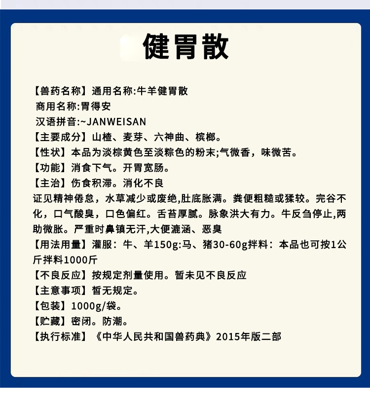 【用法用量】马、牛150~250g;羊、猪30~60g。