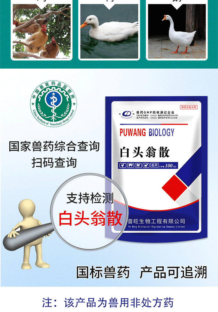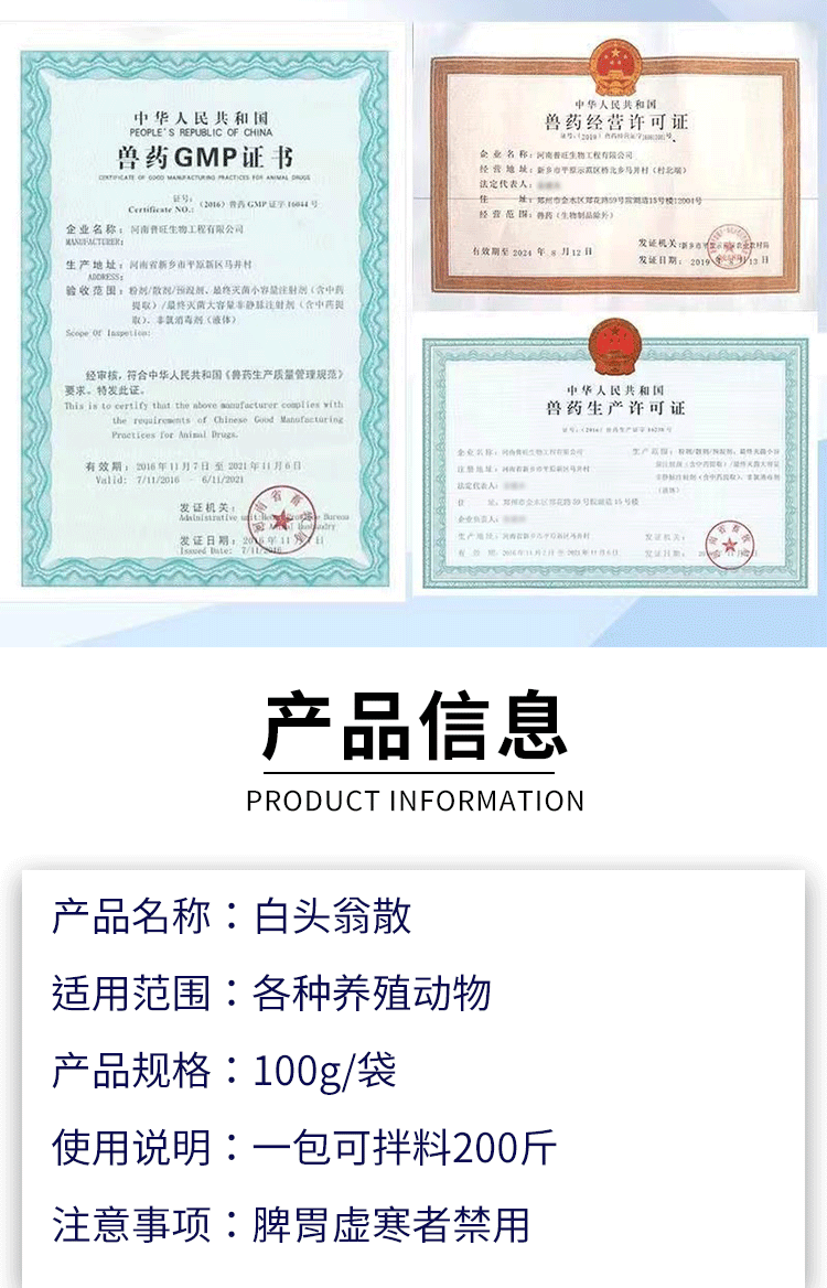 【用法用量】每袋100g拌200斤料),连用5-7天,重症可酌情加量使用。