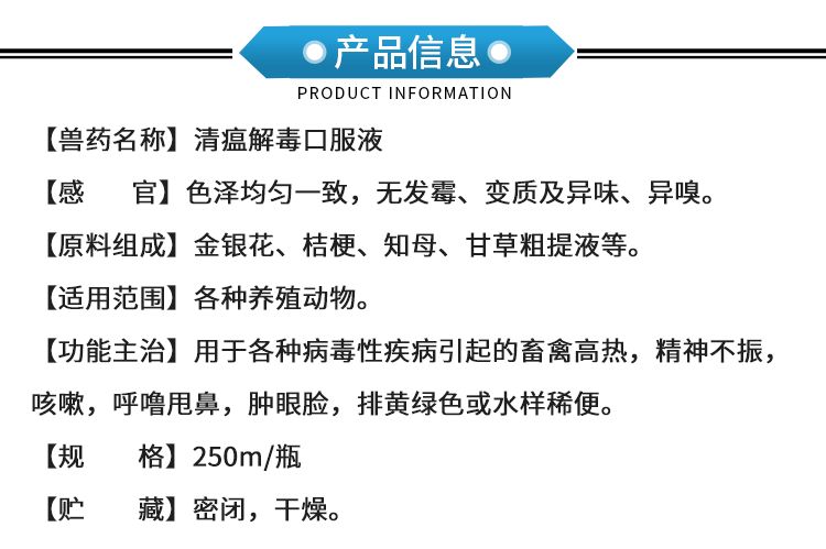 【功能主治】用于各种病毒性疾病引起的畜禽高热,精神不振,咳嗽,呼噜甩鼻,肿眼脸,排黄绿色或水样稀便。