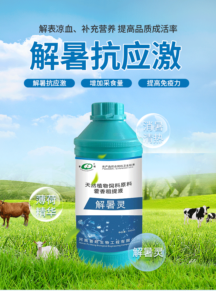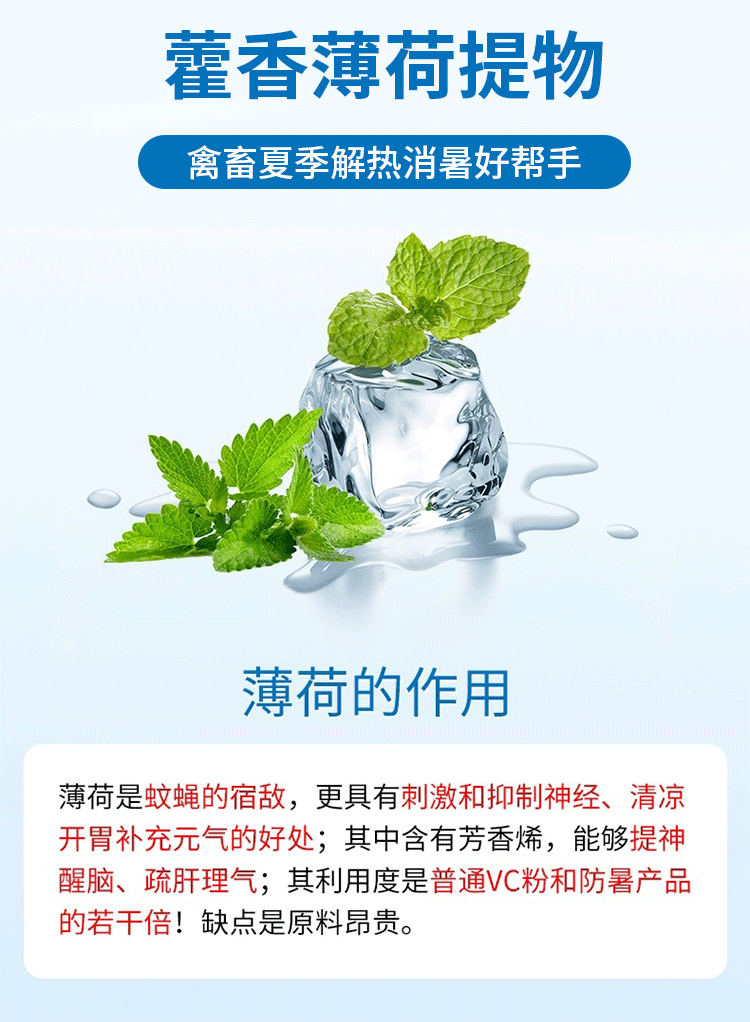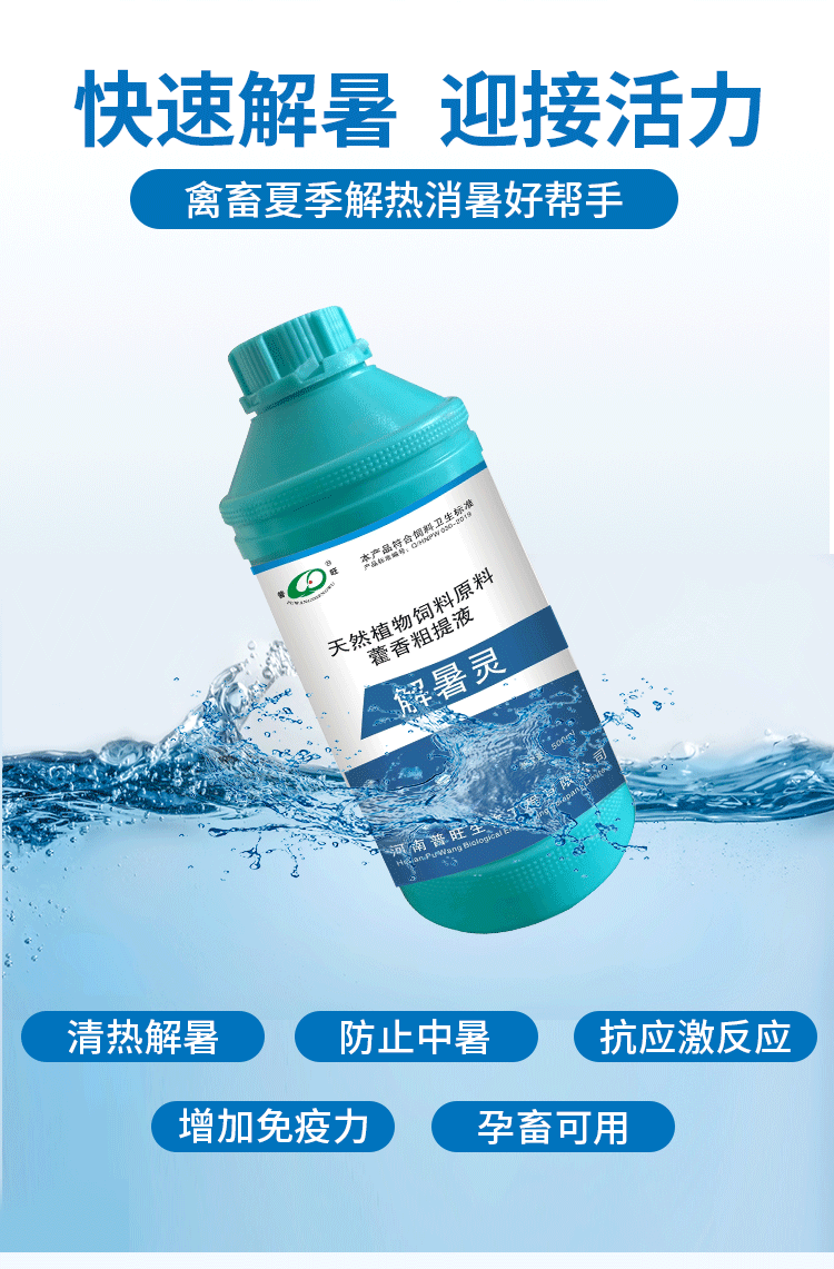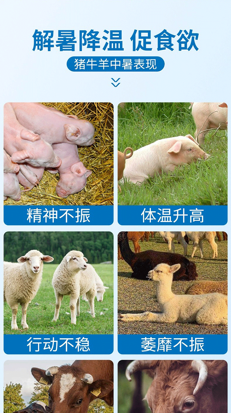1、解表祛暑,化温和中,用于采食量下降,喘气急促,中暑症,抗应激增强抗病能力,维持机体代谢平衡,促进生长发育等。