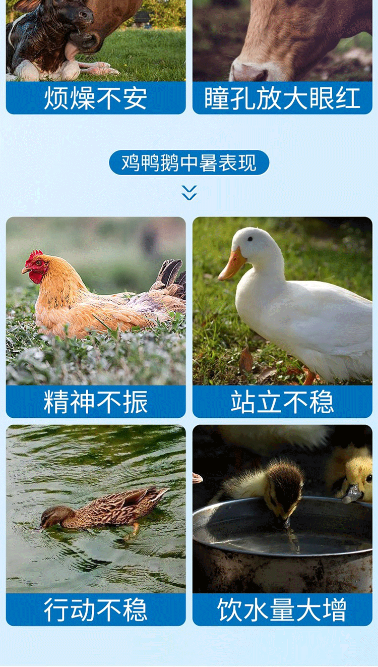 3、特别适用于防治禽兽的风寒感冒,非传染性腹泻和中暑,采食下降精神不振,肠胃不适,排白色或水样稀粪、气喘等。