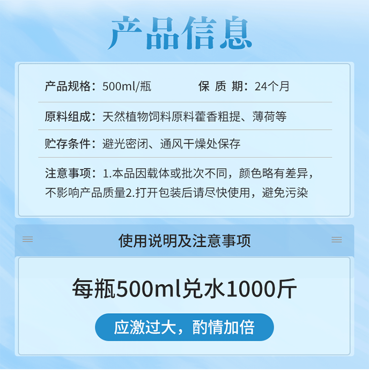 【参考用量】本品每500ml兑水1000斤,自由饮用,连用3-5天,治疗量加倍。