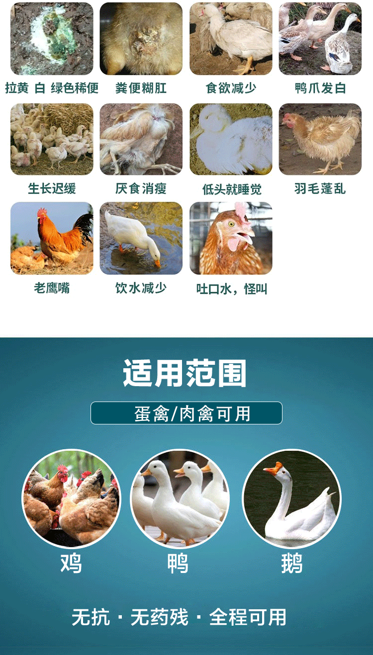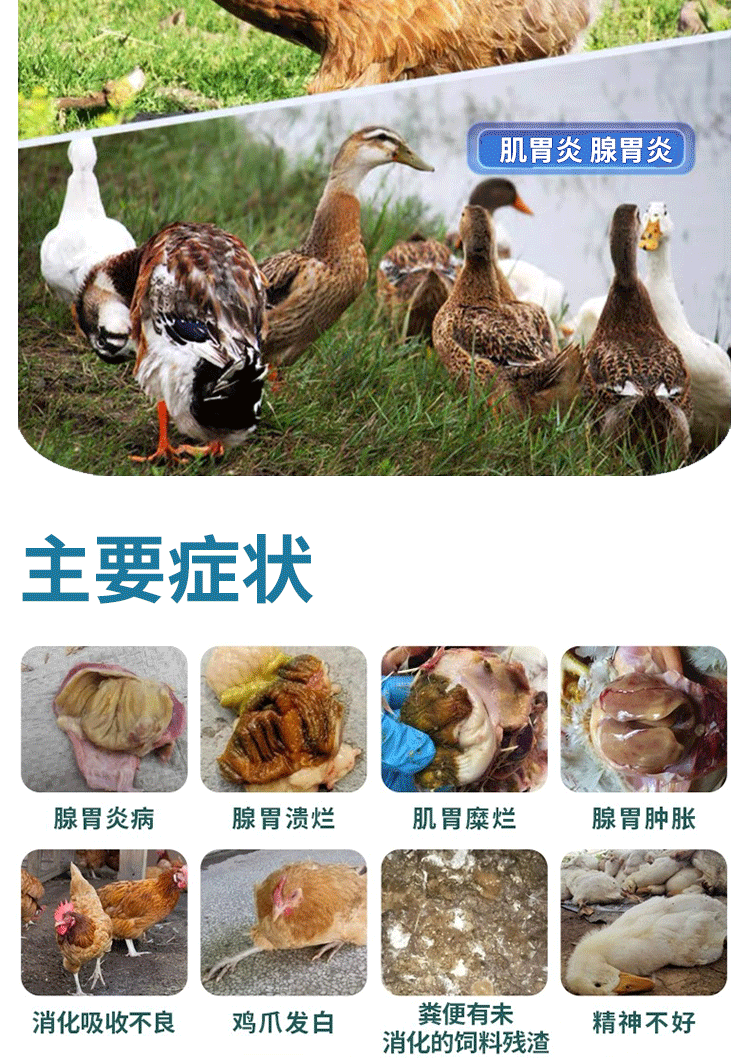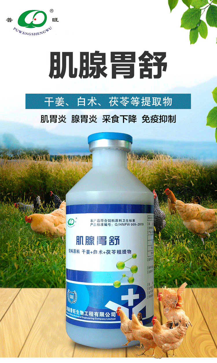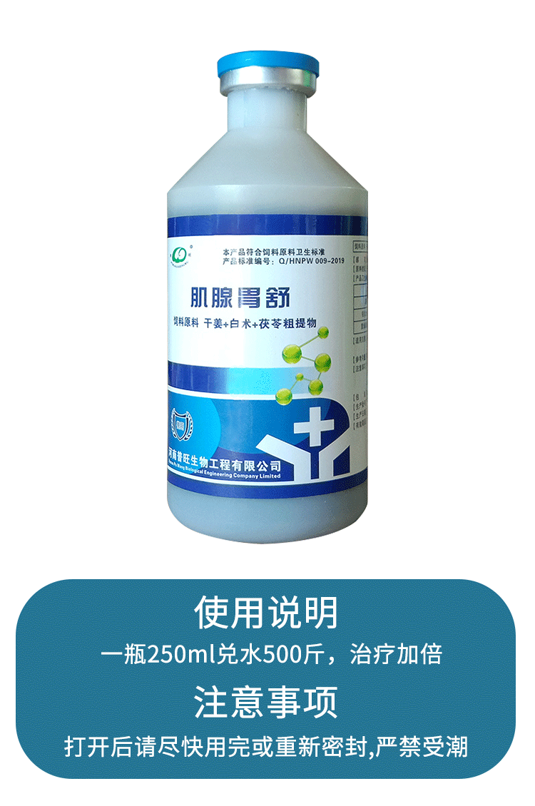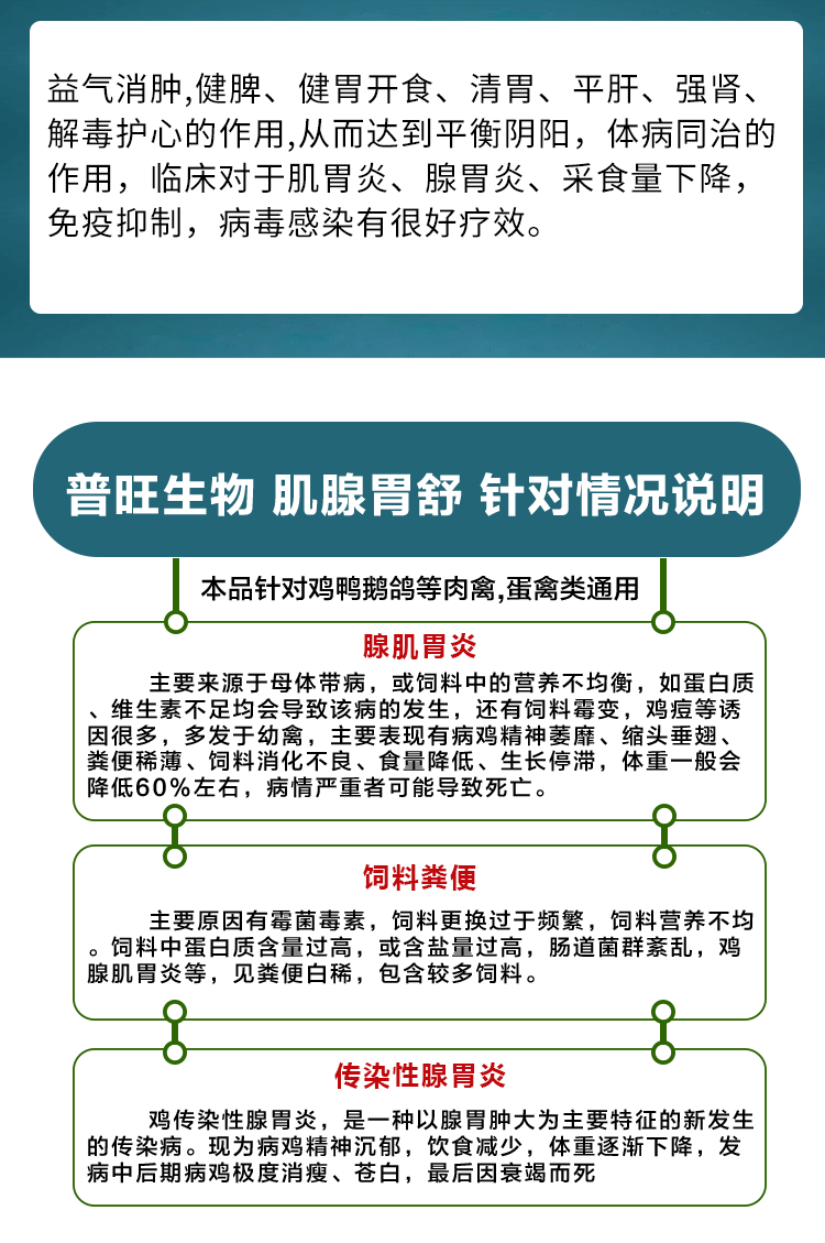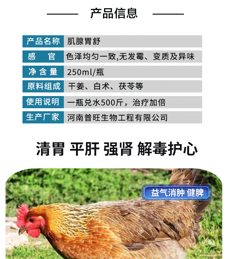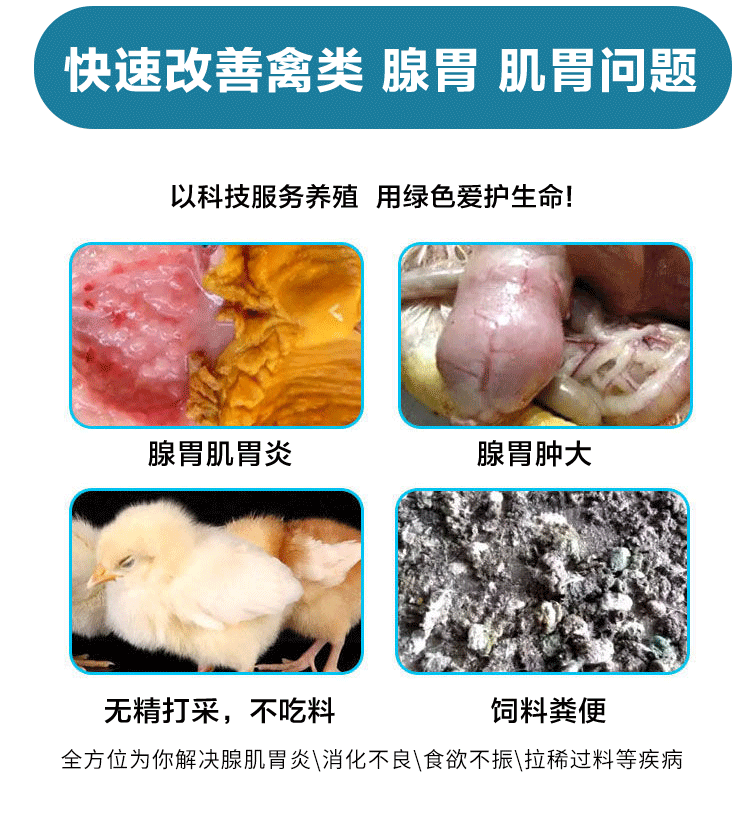【适用范围】益气消肿,健脾、健胃开食、清胃、平肝、强肾、解毒护心的作用,从而达到平衡阴阳,体病同治的作用,临床对于肌胃炎、腺胃炎、采食量下降,免疫抑制,病毒感染有很好疗效。