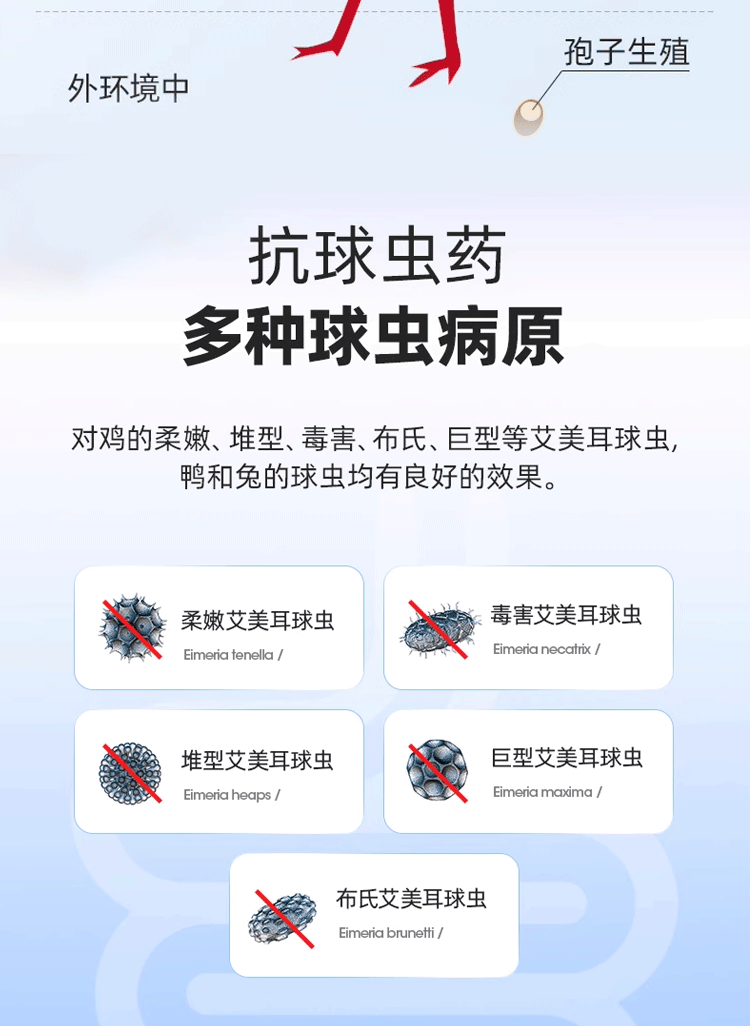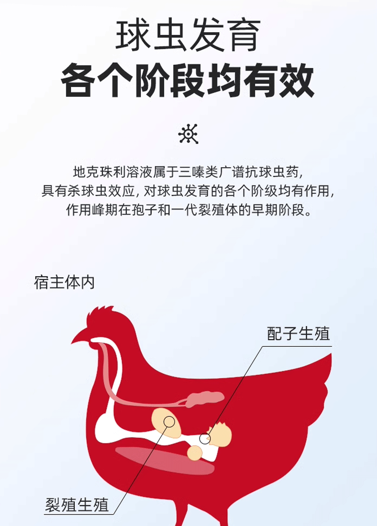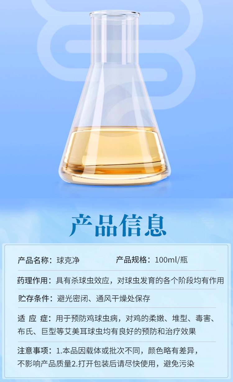【适应症】用于预防鸡球虫病,对鸡的柔嫩、堆型、毒害、布氏、巨型等艾美耳球虫均有良好的预防和治疗效果。