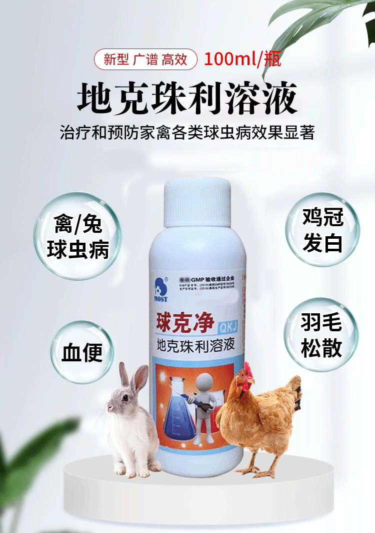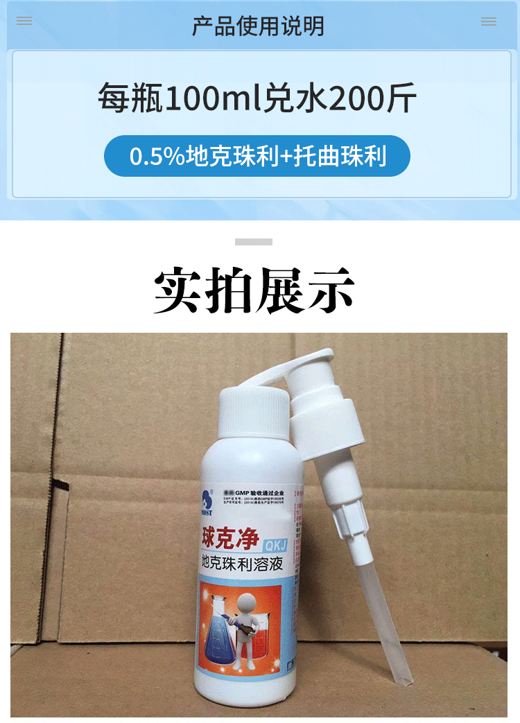 【用法用量】以地克珠利计.混饮:每1L水,鸡0.5- 1mg(即100L水,用本品10-20ml)。