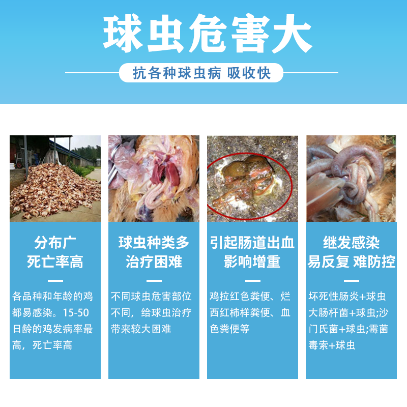 【药理作用】本品为磺胺类抗球虫药,作用峰期是球虫第二代裂殖体,对第一代裂殖体也有一定作用。本品抗菌作用较强,对禽巴氏杆菌病、伤寒亦有效。本品不影响宿主对球虫产生免疫力。