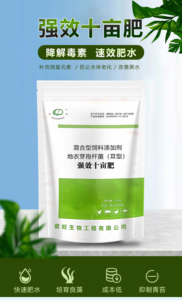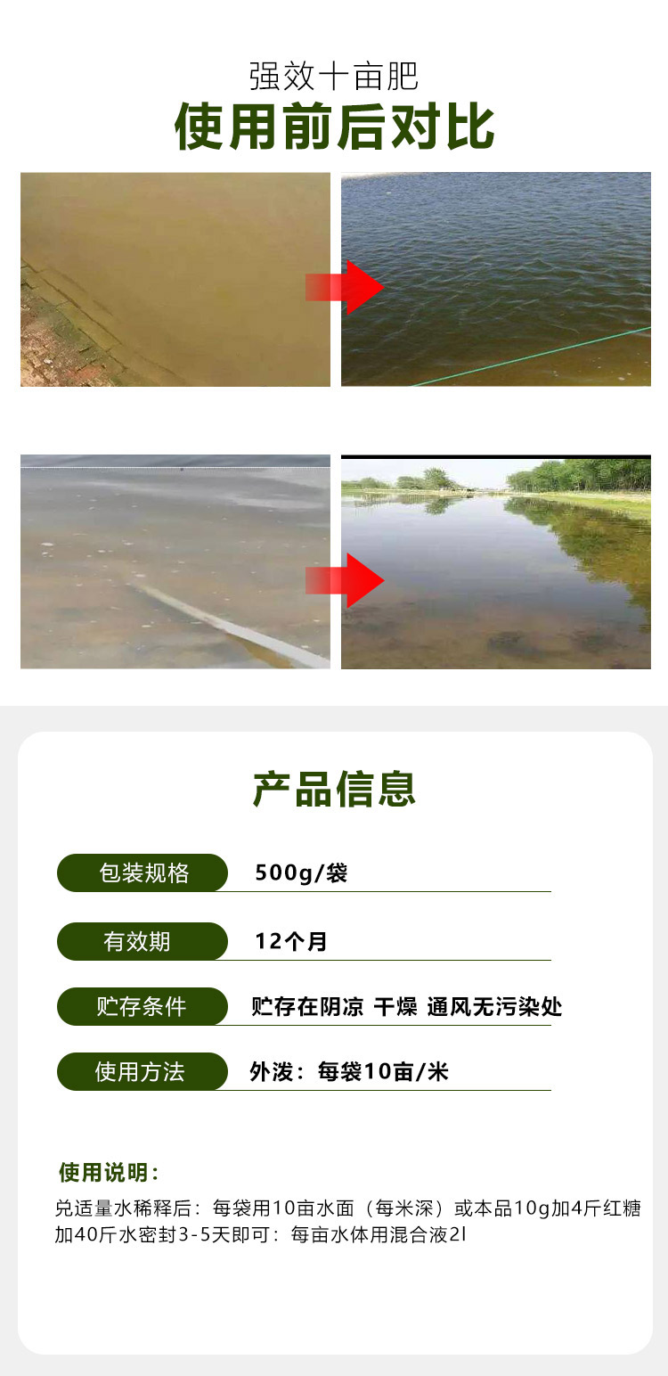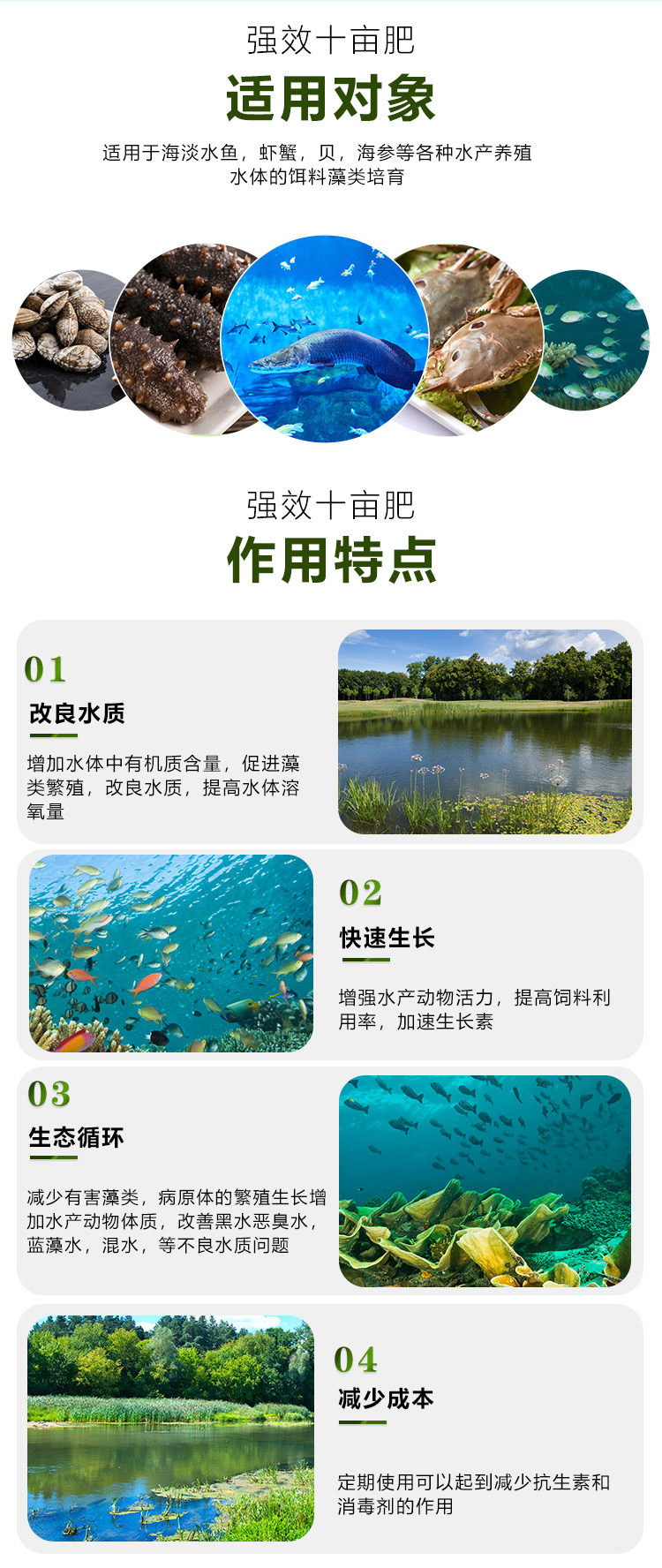 产品简介:强效十亩肥 降解毒素 补充微量元素 速效肥水 防止水体老化 适用于海淡水鱼、虾蟹、贝、海参等各种水产养殖水体的饵料藻类培育。