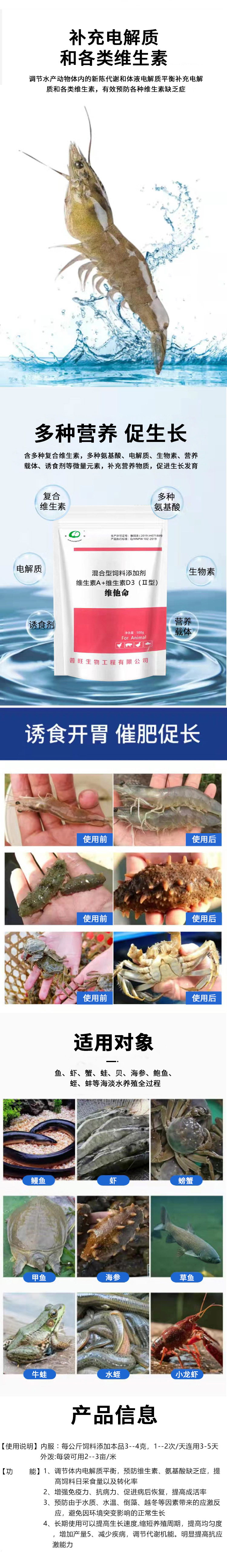 产品简介:普旺生物水产药维他命 补充电解质和各类维生素 补充维生素补充营养 促进采食促生长 保肝利胆,增强免疫力,提高成活率。