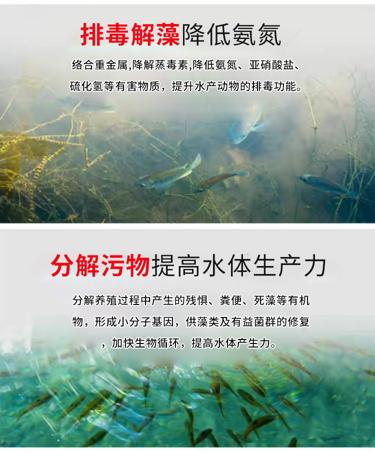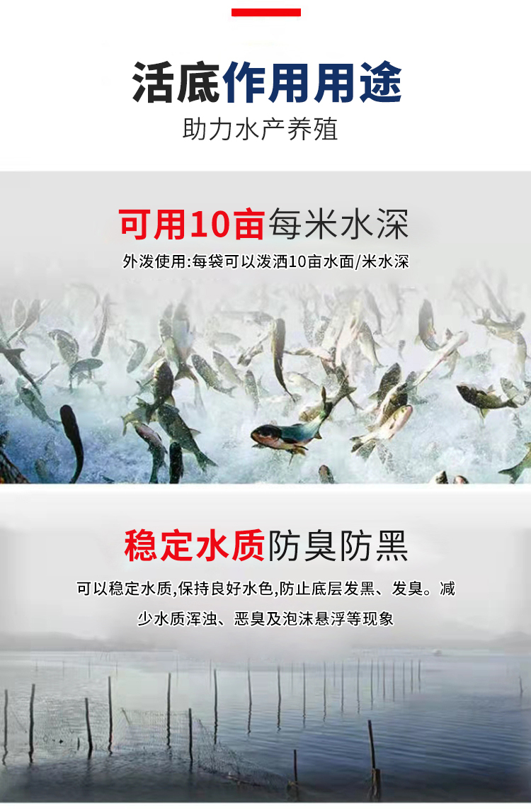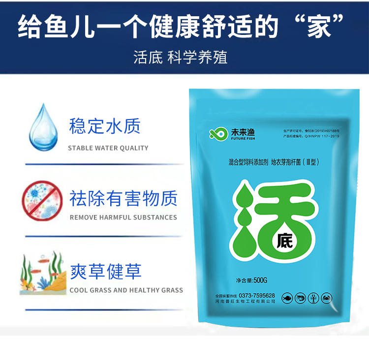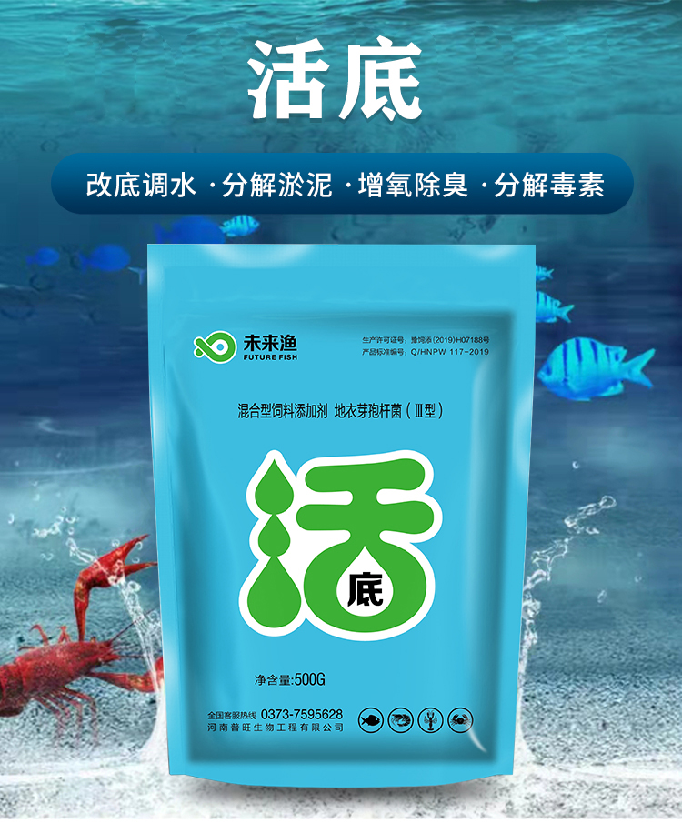产品简介:普旺兽药厂家未来渔活底调水分解淤泥增氧除臭改底灭菌水产用饲料添加剂 给水产动物一个健康舒适的家 活底 科学养殖 规格 500g/袋 保质期1个月 适用于各种水产养殖动物