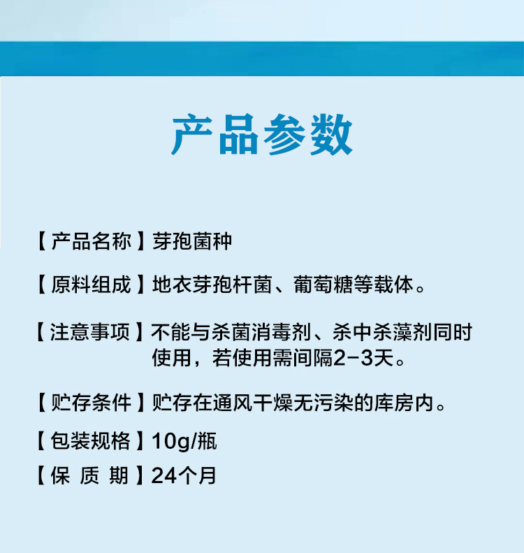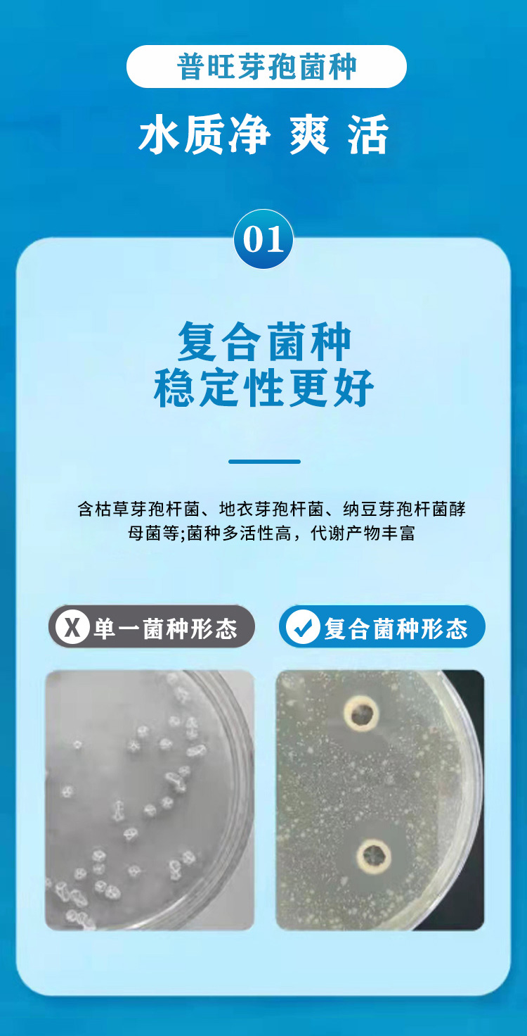 产品简介:普旺芽孢菌种水产药水产营养抗应激 复合菌种净水调水降低氨氮抑制蓝藻 分解残饵调节水质让水质净爽活