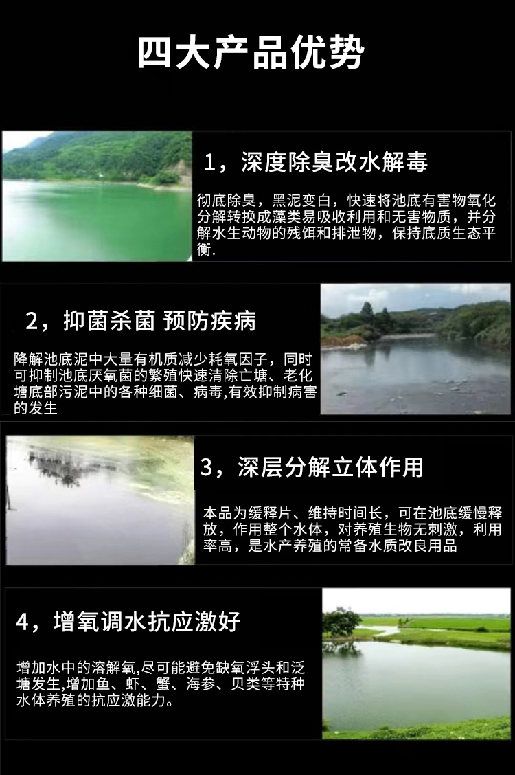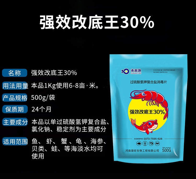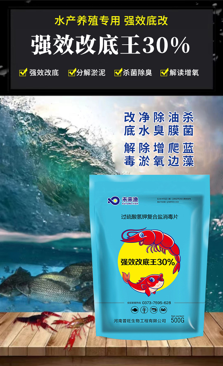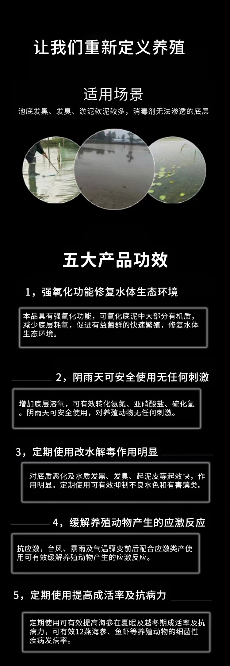 产品简介:水产养殖专用强效底改 强效改底王过硫酸氢钾复合盐30% 改底 净水 除臭 杀菌 解毒 除淤 增氧 对池水体老化、死藻、残饵、粪便过多产生的氨氮,硫化氢,亚硝酸盐、有毒胺类等超标造成的水体毒素等有良好的预防作用