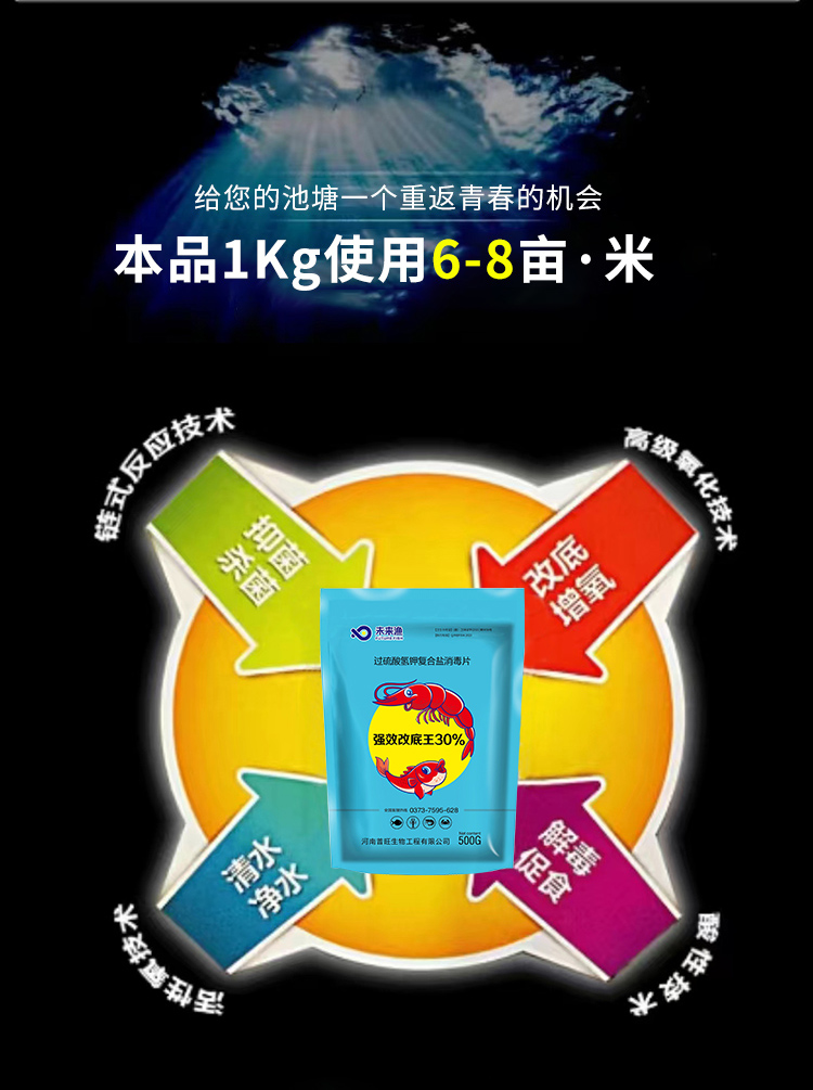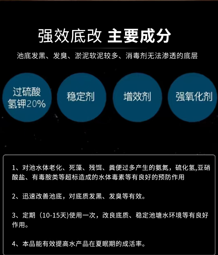 强效改底王过硫酸氢钾复合盐30% 改底 净水 除臭 杀菌 解毒 除淤 增氧 对池水体老化、死藻、残饵、粪便过多产生的氨氮,硫化氢,亚硝酸盐、有毒胺类等超标造成的水体毒素等有良好的预防作用 " />