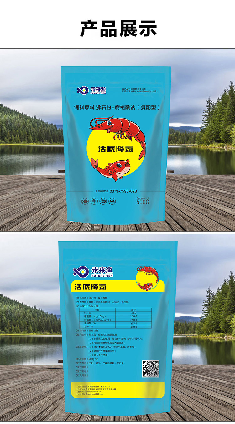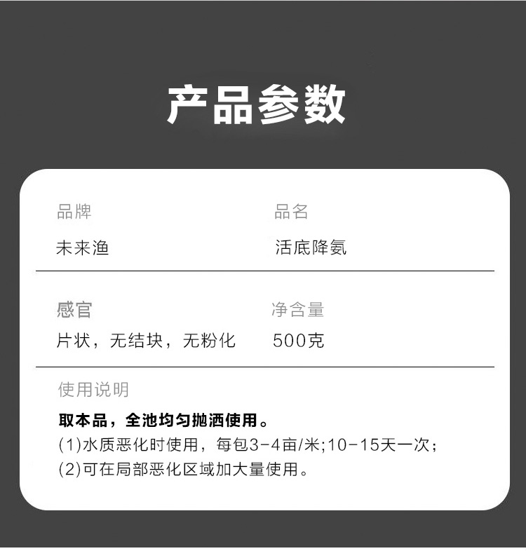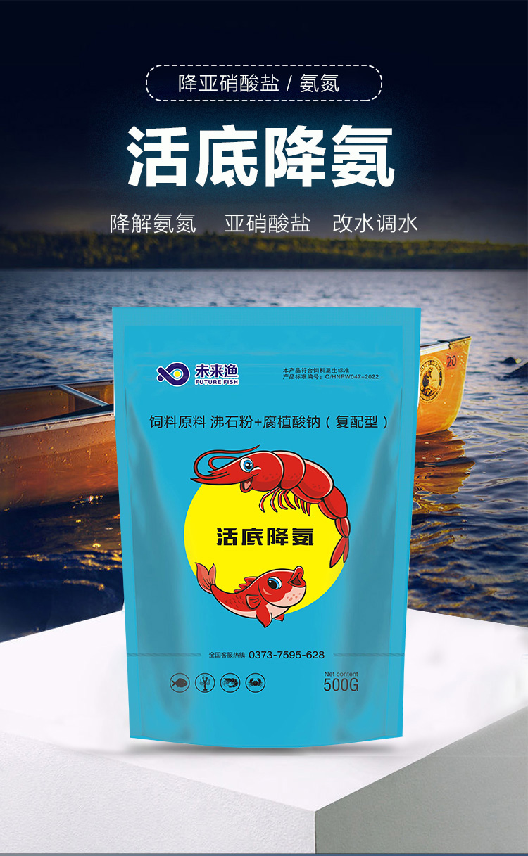 产品简介:未来渔降氨氨氮 降亚硝 控蓝藻 降COD 活底降氨 稳水爽水 预防氨中毒 每包3-4亩/米10-15天一次