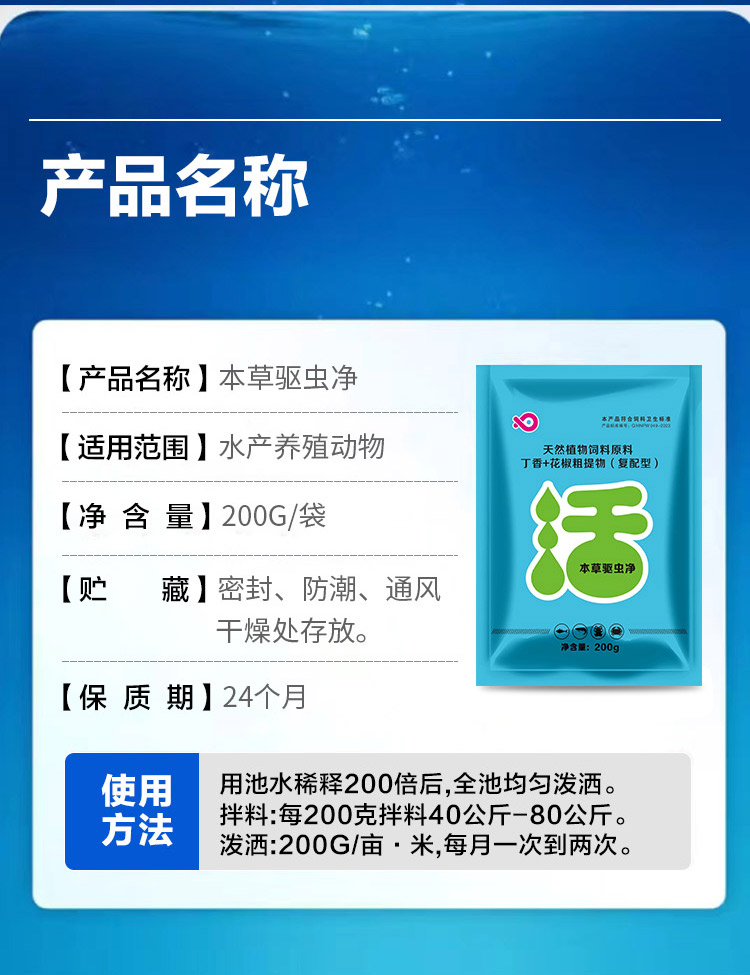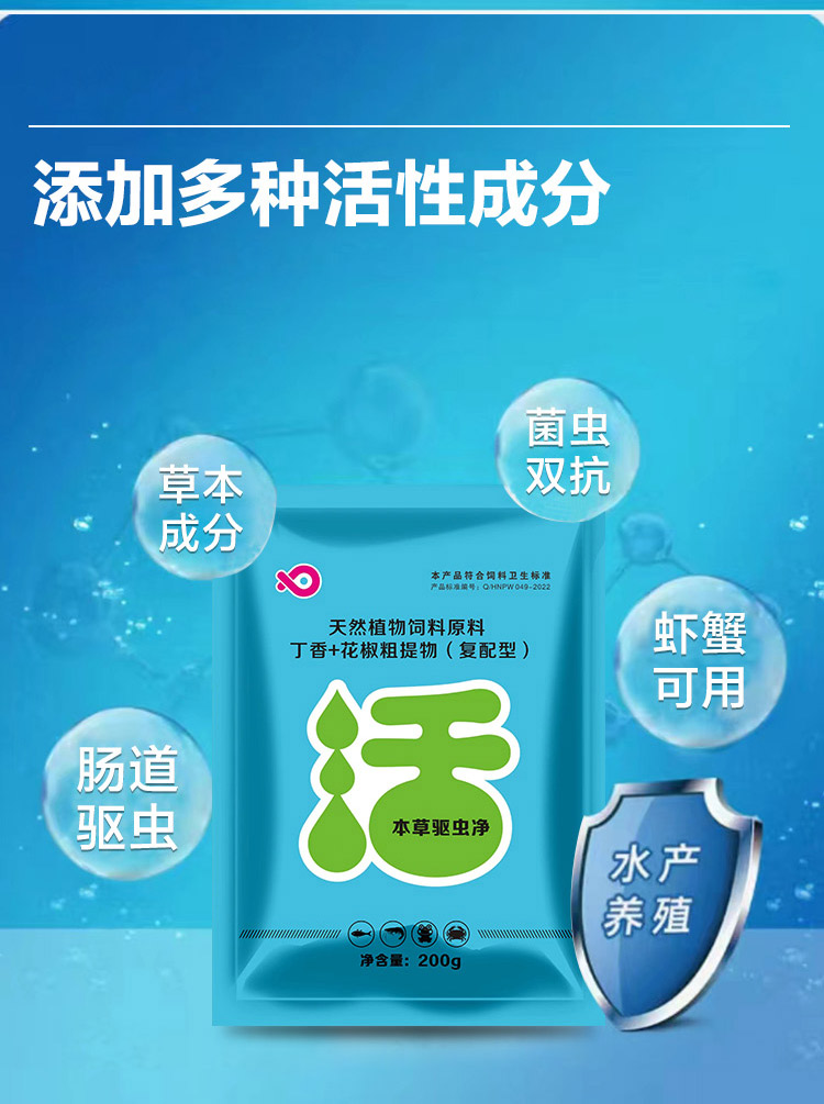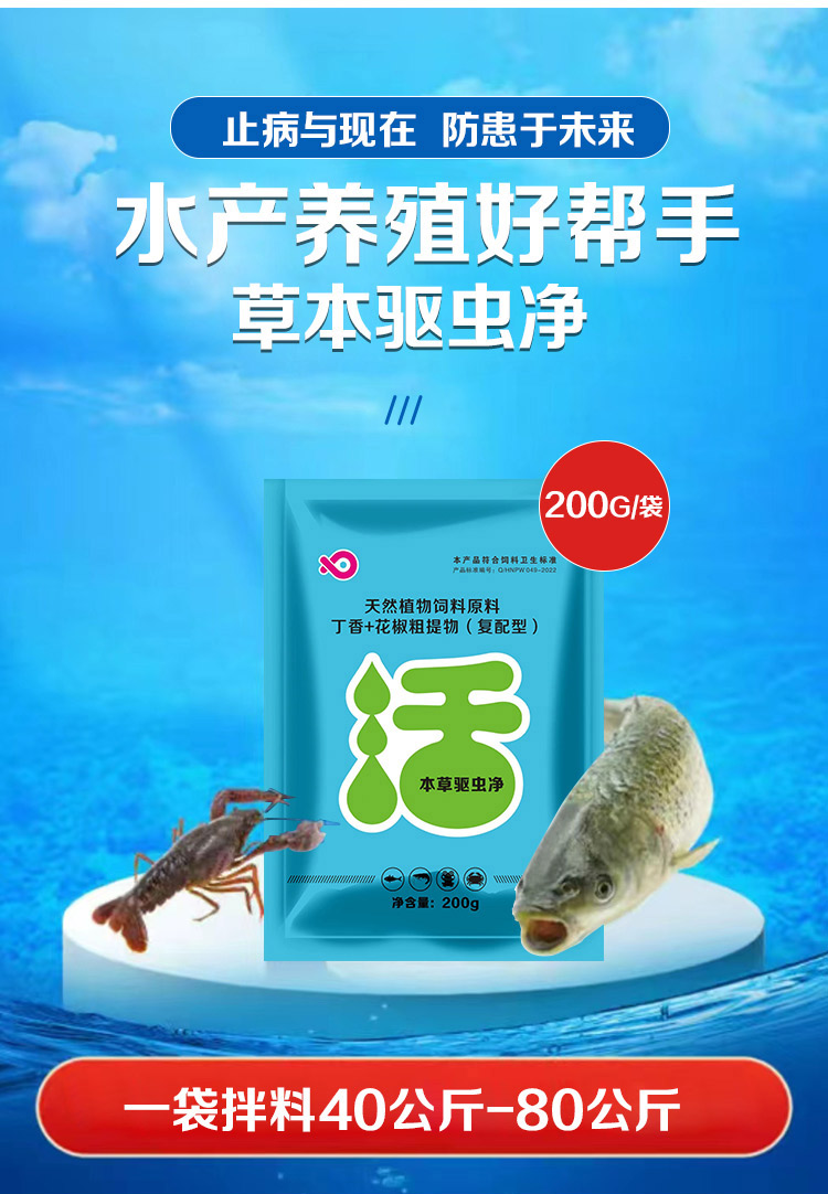 产品简介:止病于现在防患于未来 本草驱虫净 草本成分 菌虫双抗 肠道驱虫 虾蟹可用 一袋拌料40-80公斤。使用方法,用池水稀释200倍后,全池均匀泼洒。 拌料,每200克拌料40-80公斤。泼洒,200克/亩·米,每月一次到两次。