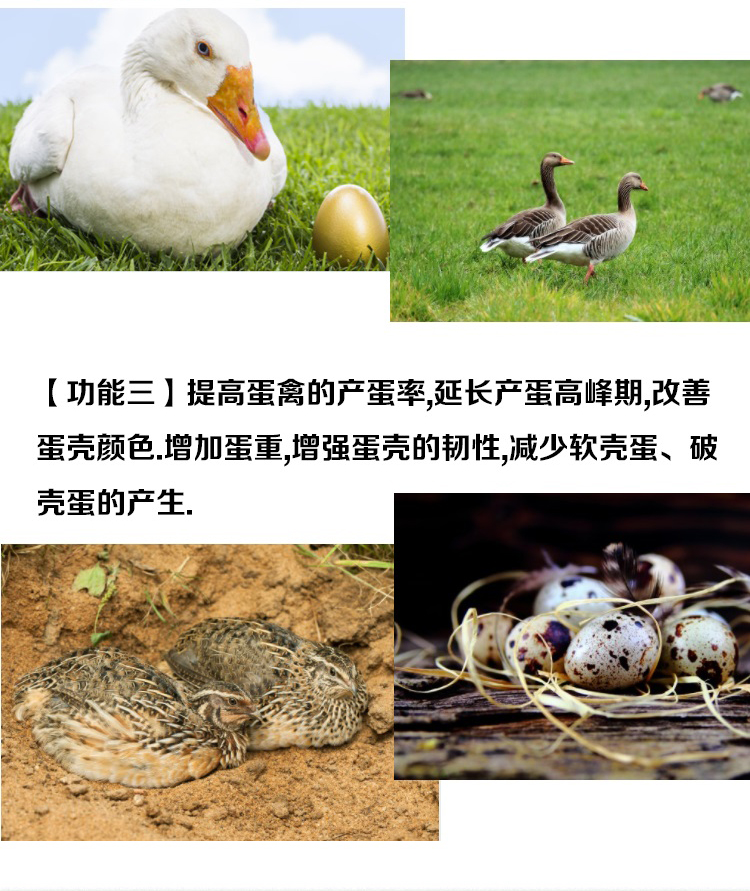 长期保健使用:可提高蛋壳品质,增强色素沉着,改善蛋禽的消化吸收功能,增进食欲,提高料蛋比。