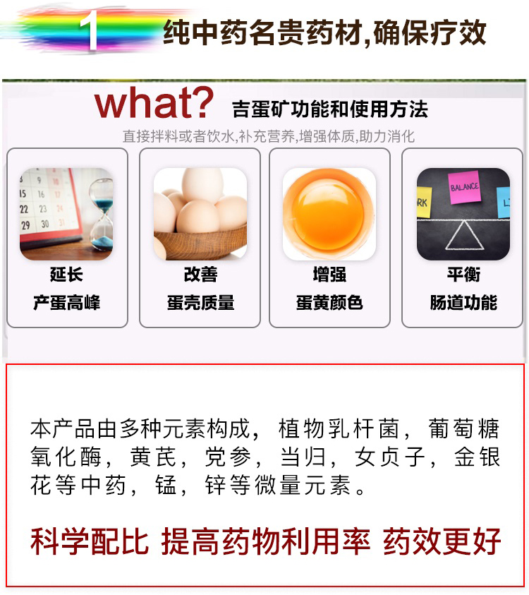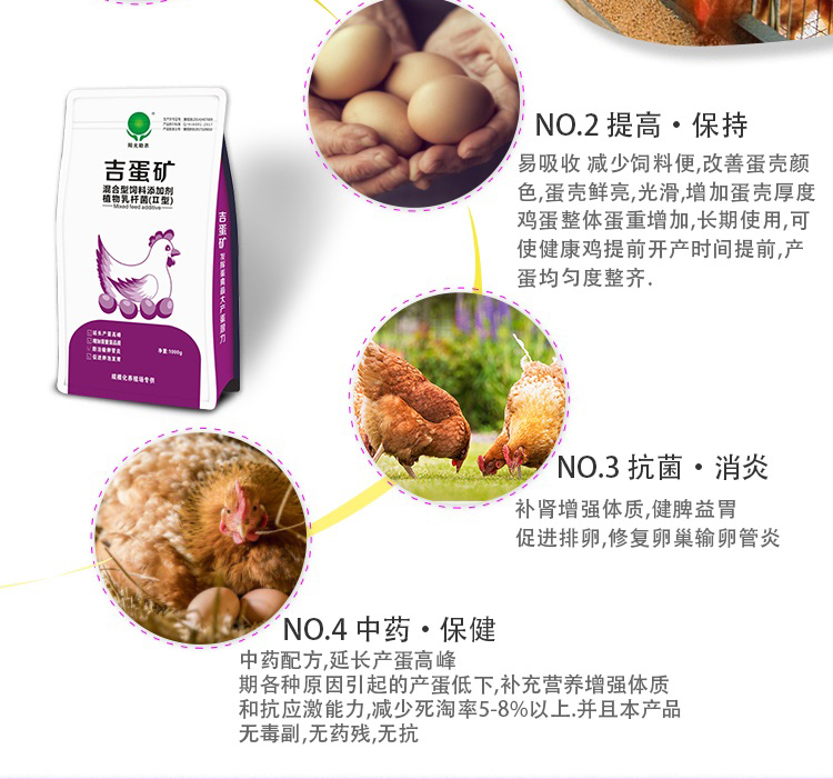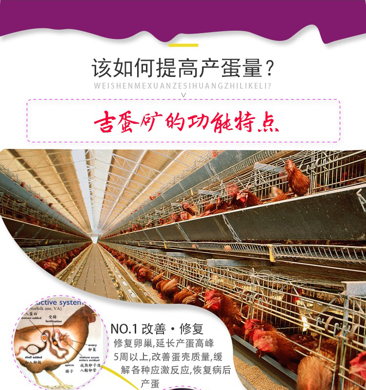 产蛋多了:本品激活卵巢功能,促进卵泡发育、成熟与排卵,延长产蛋高峰期。使用吉蛋矿15-20天,产蛋率可增