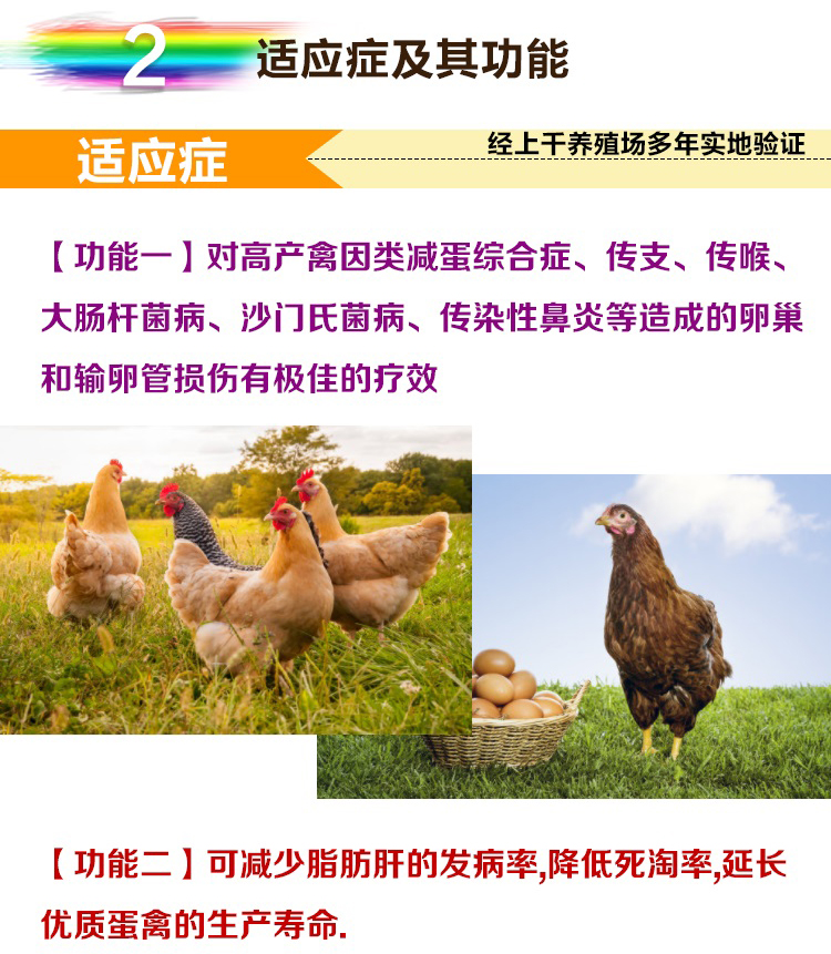 1. 延长鸡产蛋高峰 2.增加产蛋率蛋重 3.防治鸡输卵管炎 4.促进鸡卵泡发育 5.防治产蛋疲劳症