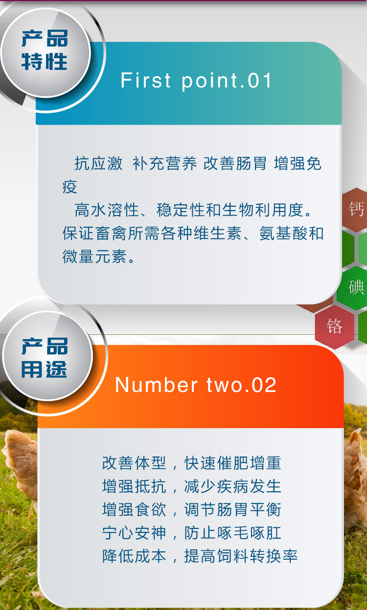 保证畜禽正常生理功能所需的各种维生素,氨基酸和微量元素,有效防止营养缺乏,抗应激;有效改善肠胃功能,刺激免疫系统发育,增强免疫力。