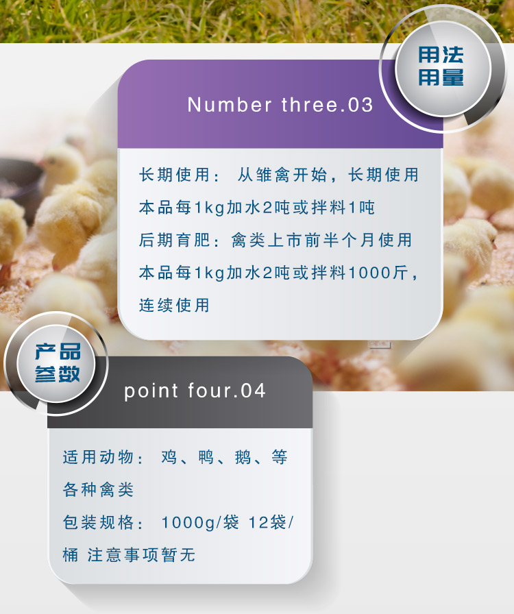 1.长期添加使用;从雏禽开始,长期持续使用,本品每1kg加水2吨或拌料一吨。