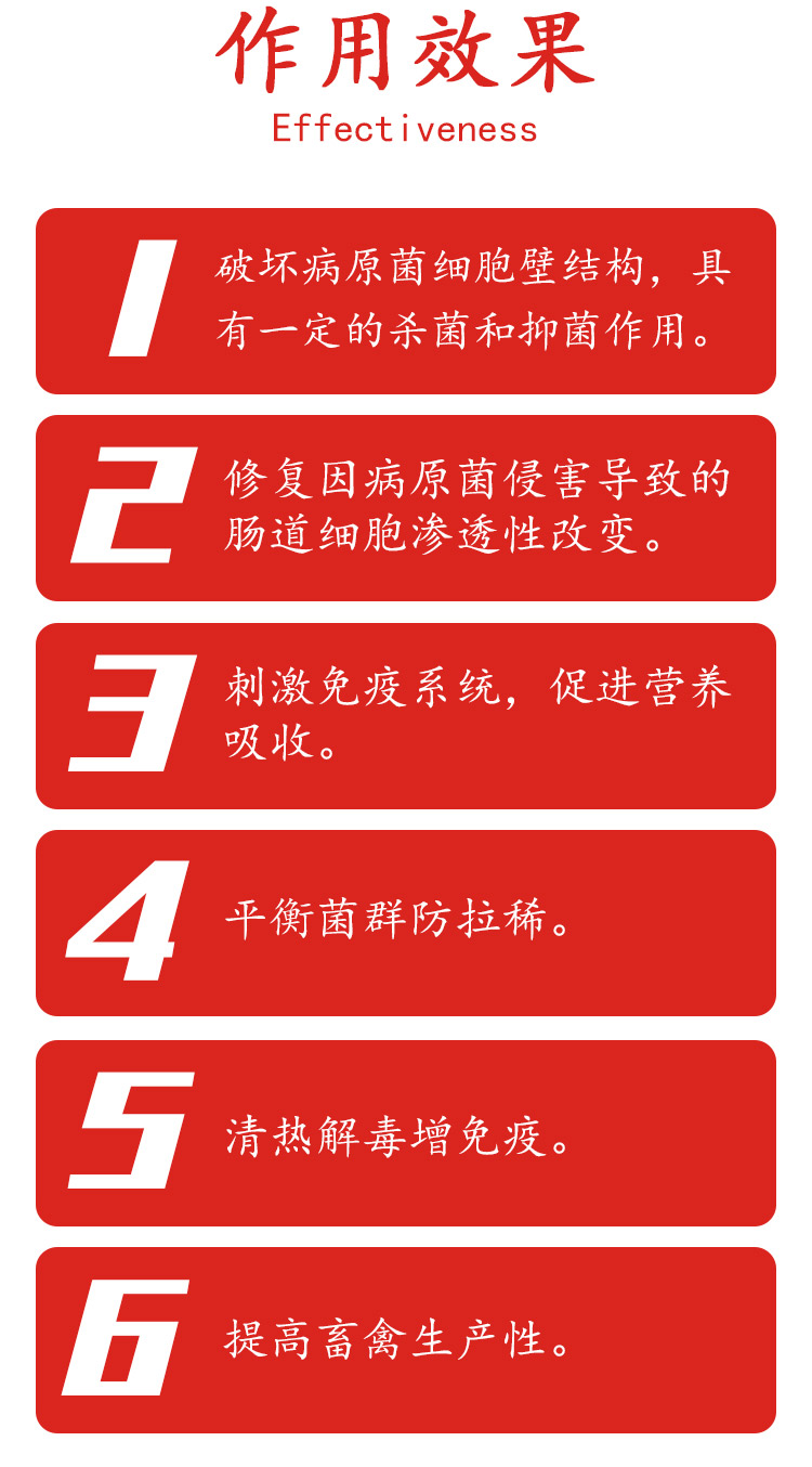 开胃助消化,平衡菌群,防止拉稀,清热解毒增强免疫力,提高畜禽生产力。