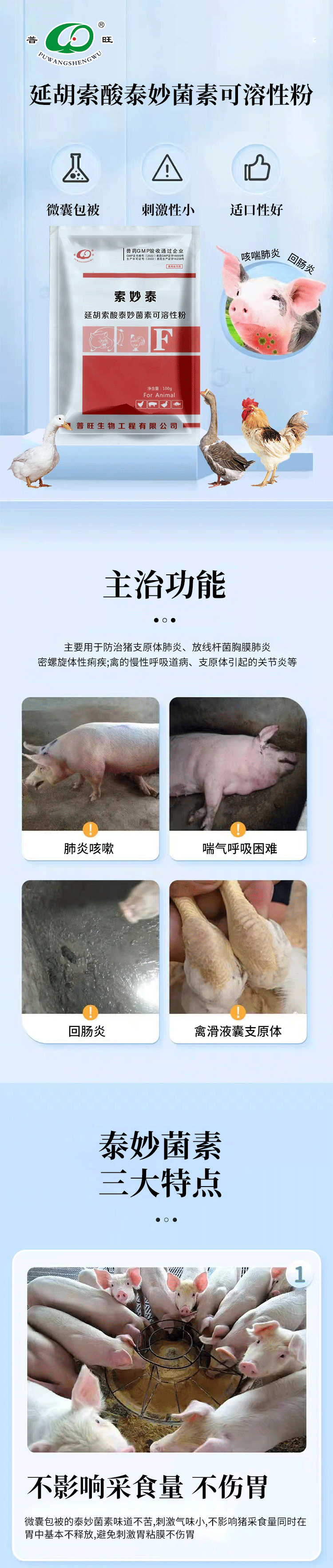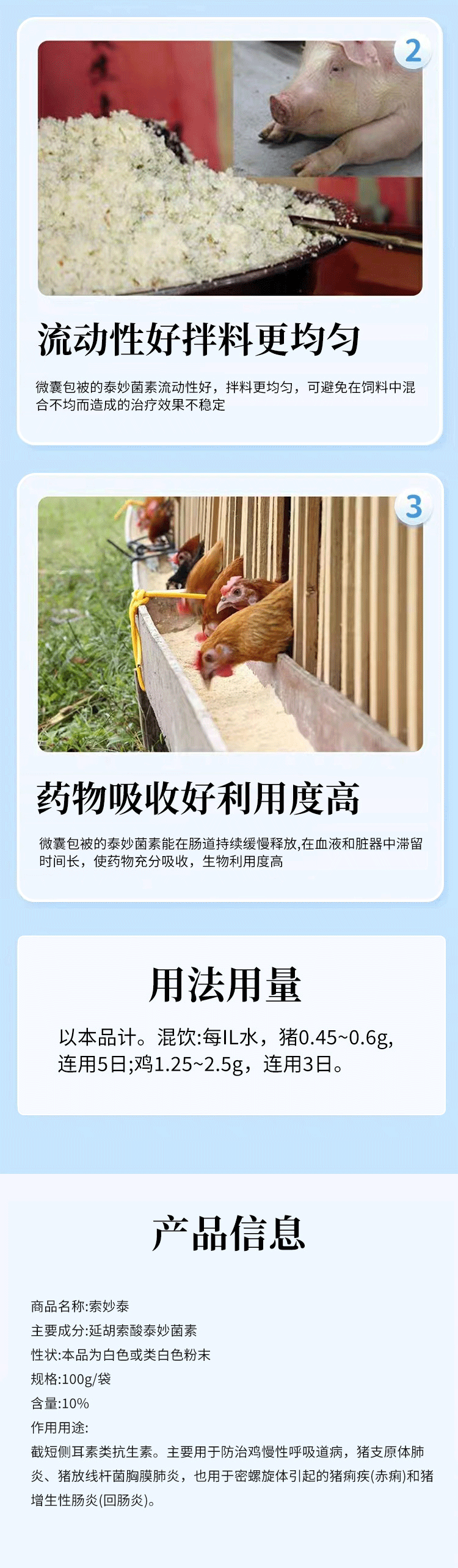 产品简介:主要用于防治猪支原体肺炎、放线杆菌胸膜肺炎 密螺旋体性痢疾;离的馒性呼吸道病、支原体引起的关节炎等