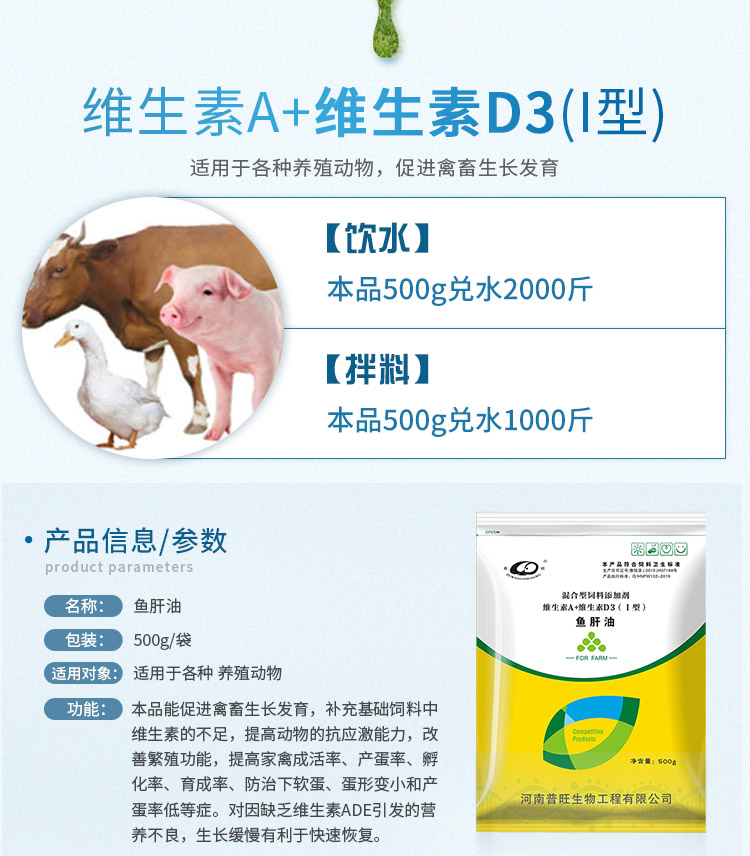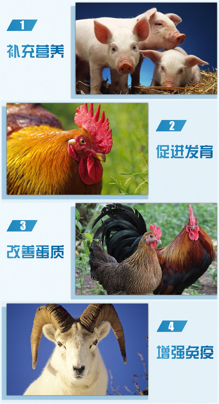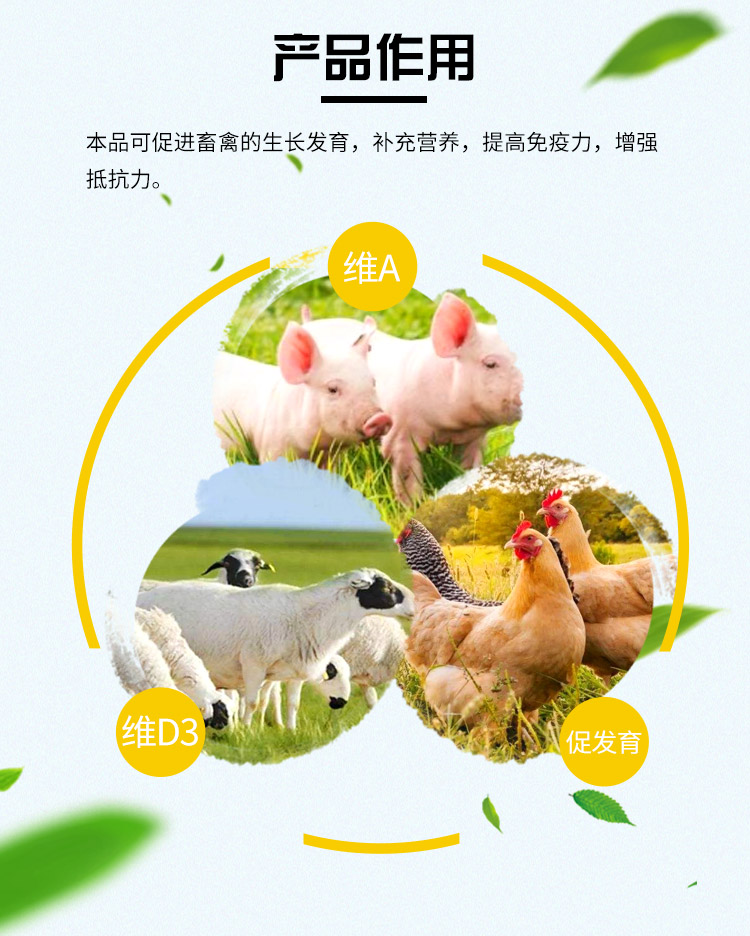 【功能与特点】本品能促进畜禽生长发育,补充基础饲料中维生素的不足,提高动物的抗应激能力,改善繁殖功能,提高家禽成活率、产蛋率、孵化率、育成率、防止下软蛋、蛋形变小和产蛋率降低等症。对因缺乏维生素ADE引起的发育不艮,生长缓慢,有利于快速恢复。